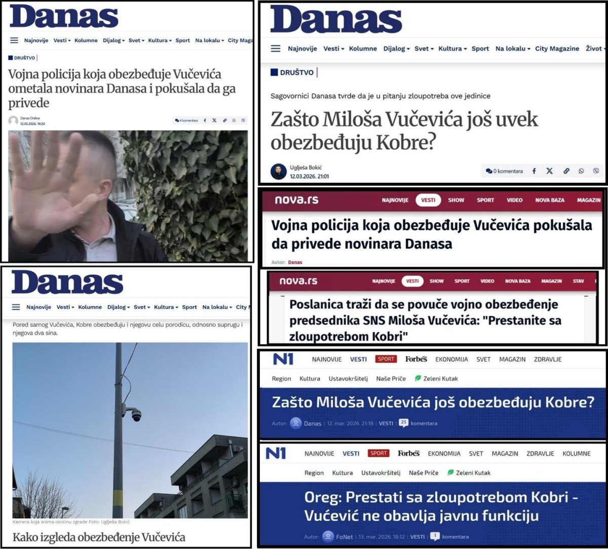 U kampanju targetiranja Miloša Vučevića su se uključili i N1 i NovaS. Portal N1 je objavio sraman tekst pod naslovom: „Zašto Miloša Vučevića još obezbeđuju Kobre?“. Portali „Nove“ i „Danasa“ su 12.3.2026. su objavili sraman tekst pod naslovom: „Vojna policija koja obezbeđuje Vučevića pokušala da privede novinara Danasa“. U tom tekstu „Danas“ otkriva ime novinara koji je pratio Miloša Vučevića i njegovu porodicu, i koji je objavljivao poverljive podatke o štićenoj ličnosti. List „Danas“ potvrđuje da je njihov novinar slikao zgradu Miloša Vučevića, sigurnosne kamere, i pripadnike Kobri, i kaže: „Vojna policija koja čuva predsednika SNS-a Miloša Vučevića pokušala je da privede novinara Danasa Uglješu Bokića nakon što je uslikao jednog njihovog pripadnika koji dežura ispred stambene zgrade u Novom Sadu u kojoj Vučević živi. Bokić je u sredu prepodne došao ispred Vučevićeve zgrade kako bi fotografisao njegovo obezbeđenje. Nakon što je fotografisao kameru koja je pre nekoliko meseci instalirana na stub da snimi i okolinu Vučevićeve zgrade, prišao je mlađem muškarcu u civilu za koga je pretpostavio da je vojno lice koje obezbeđuje Vučevića. Muškarac je izvadio vojnu legitimaciju i rekao da je tu da obezbeđuje objekat, a zatim zamolio novinara da ga ne fotografiše. Bokić je u popodnevnim satima ponovo došao do Vučevićeve zgrade, ispred koje nije bilo nikoga, ali je u službenom automobilu „Škoda“ sedeo isti vojni policajac. Nakon što je Bokić napravio nekoliko fotografija. Zatim je Bokić izvadio telefon i počeo da snima policajca“. Portal N1 je 13.3.2026. objavio sraman tekst pod naslovom: „Oreg: Prestati sa zloupotrebom Kobri - Vućević ne obavlja javnu funkciju“. Portal propalog lista „Nova“ je 13.3.2026. objavio sraman tekst pod naslovom: „Poslanica traži da se povuče vojno obezbeđenje predsednika SNS Miloša Vučevića: "Prestanite sa zloupotrebom Kobri"“. U oba teksta se prenosi poziv poslanice antisrpske terorističke stranke PSG, u Skupštini Srbije, da se ukine obezbeđenje Milošu Vučeviću.