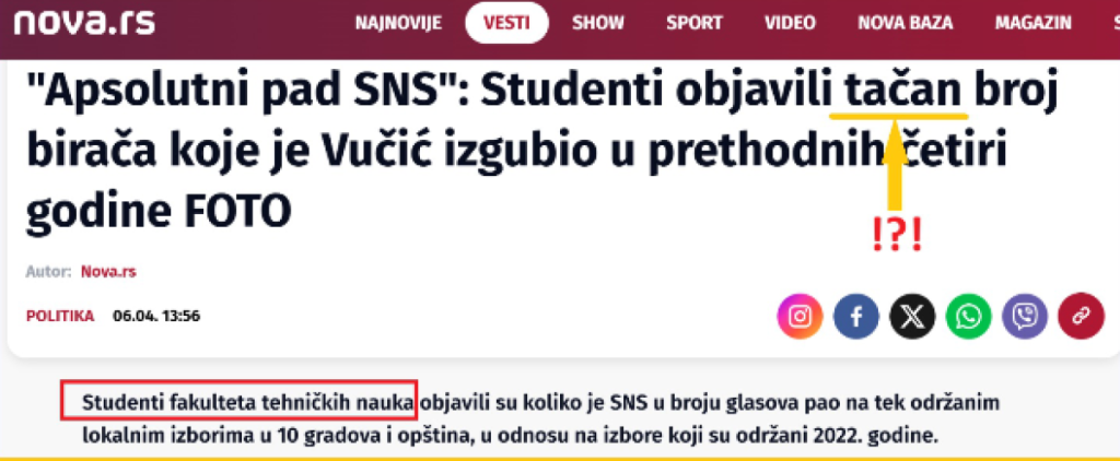 O čemu se radi? Koji je to tekst na NovaS, na čije laži je ukazao predsednik Vučić? Propali portal, propale novine NovaS je 6.4.2025. godine, objavio obmanjujući tekst pod naslovom: „„Apsolutni pad SNS“: Studenti objavili tačan broj birača koje je Vučić izgubio u prethodnih četiri godine“. NovaS prenosi lažno istraživenje studenata blokadera sa FTN Novi Sad.
