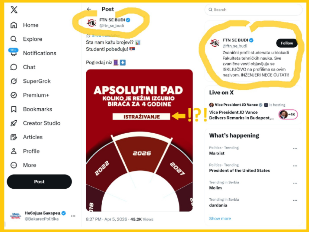 i 2026. se drastično razlikuje. Na primer – Zavetnici i Zdrava Srbije su 2022. bili žestoke opozicione stranke, koje su nemilosrdno napadale Vučića i SNS. Zavetnike i Zdravu Srbiju je ostatak opozicije priznavao kao opoziciju. Stoga je potpuno činjenično pogrešno kada blokaderi FTN, rezultat Zavetnika i Zdrave Srbije, tada opozicije, iz 2022. godine, dodaju rezultatu SNS iz 2022. Zapanjujuće pogrešno. Logička greška. Sabiranje baba i žaba. Isto važi i za grešku blokadera FTN, koji rezultatu SNS iz 2022., svuda dodaju glasove SRS iz 2022. SRS je opoziciona stranka. Drugo, potpuno je metodološki pogrešno rezultatu SNS iz 2022. dodati i rezultat SPS i JS. SNS i SPS-JS su tada 2022. godine, na lokalne izbore išli odvojeno. SPS-JS su želeli da profitiraju na faktoru „početak rata u Ukrajini“ u čemu su uspeli i na lokalu i na parlamentarnim izborima. Na sledećim izborima 2023. i 2024. taj profit je nestao. Činjenica je da nije oslabio SNS, oslabili su SPS i JS. SNS je ojačao. Potpuno je pogrešno rezultatu SNS iz 2022. dodavati rezultat SPS-JS. Tome pridodajte informaciju koju je saopštio predsednik Vučić uveče 29.3.2026., koji je izjavio da najnovije omnibus istraživanje pokazuje da SNS trenutno ima najbolji rejting u poslednjih 5 godina. Podsećam na rezultate izbora 29.3.2026. godine. Fantastičan je rezultat SNS u svih 10 lokalnih samouprava gde su održani izbori. U Aranđelovcu SNS 52,96%, blokaderi 44%. U Bajinoj Bašti SNS 53,49 %, blokaderi 41,35%. U Boru SNS 49,22 %, blokaderi 42%. U Kladovu SNS 72 %, blokaderi 26,69%. U Knjaževcu SNS 57,11 %, blokaderi 32,9%, opozicija 8,9%. U Kuli SNS 50,52%, blokaderi 48%. U Lučanima SNS 63,78 %, blokaderi 30%. U Majdanpeku SNS 65,64%, blokaderi 19%, opozicija 13%, U Sevojnu SNS 51,5, blokaderi 44,8% i u Smederevskoj Palanci SNS 58%, blokaderi 29,22, opozicija 9,5%. Kada se pogleda lažno istraživanje, tj. primitivna i namerno pogrešna računica studenata blokadera FTN prikazana u tekstu i na „X“ profilu blokadera FTN vidimo sledeće. Objasniću stavku po stavku.