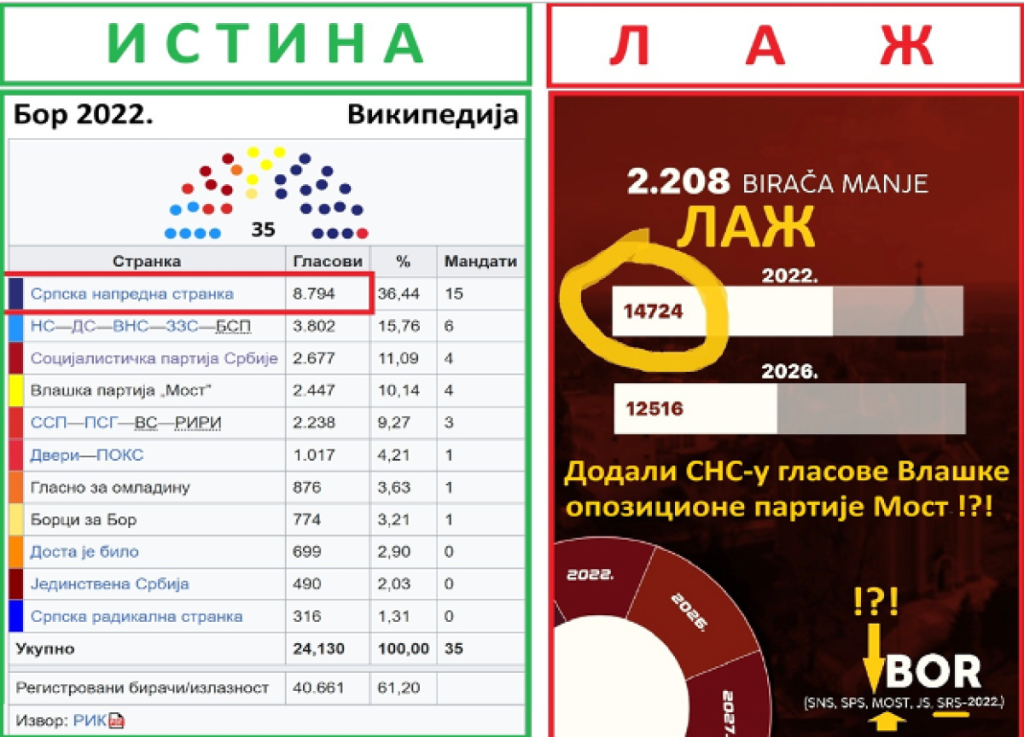 Bor. Najveća obmana blokadera FTN i NovaS se odnosi na Bor. Tu je predsednik poentirao. Blokaderi FTN i NovaS su rezultatu SNS u Boru prevarantski dodali rezultat nesumnjivo opozicione liste u Boru – liste „Vlaška partija Most“, koja je dobila 2447 glasova 2022. godine. To su bili glasovi protiv SNS. Drastična je obmana javnosti, te glasove dodati rezultatu SNS iz 2022. Tu se ne radi čak ni o sabiranju baba i žaba. Tu se radi o namernoj prevari od strane blokadera FTN, da bi pokušali da dokažu svoje laži. Pali su na ispitu. U Boru SNS 2026. godine, ima 49,22 %, a blokaderi i opozicija 42%.