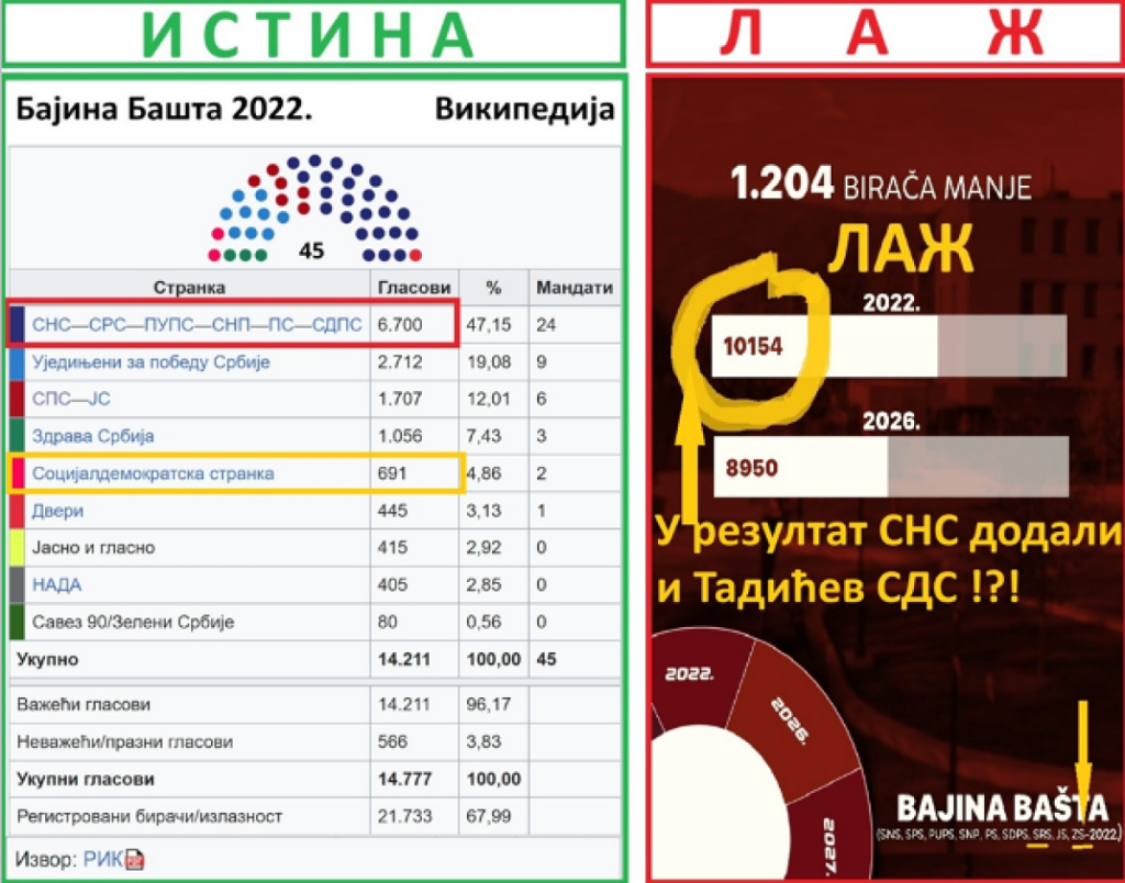 Bajina Bašta. Sledeća velika obmana blokadera FTN i NovaS se odnosi na Bajinu Baštu. Blokaderi FTN i NovaS su rezultatu koalicije „SNS, SRS, PUPS, SNP, PS, SDPS“ 2022. u Bajinoj Bašti 2022., prevarantski dodali rezultat nesumnjivo opozicione liste u Boru – liste „Socijaldemokratska stranka“ Borisa Tadića, koja je dobila 691 glas 2022. godine, i dodali su takođe prevarantski rezultat nesumnjivo opozicione liste u Boru – liste „Zdrava Srbija“ (1056 glasova), koja je te 2022. bila žestoko i dokazano opoziciona stranka. To su bili glasovi protiv SNS. Drastična je obmana javnosti, te glasove dodati rezultatu SNS iz 2022. Tu se ne radi čak ni o sabiranju baba i žaba. Tu se radi o namernoj prevari od strane blokadera FTN, da bi pokušali da dokažu svoje laži. Pali su na ispitu. U Bajinoj Bašti SNS 2026. godine, ima 53,49 %, a blokaderi i opozicija 41,35%.