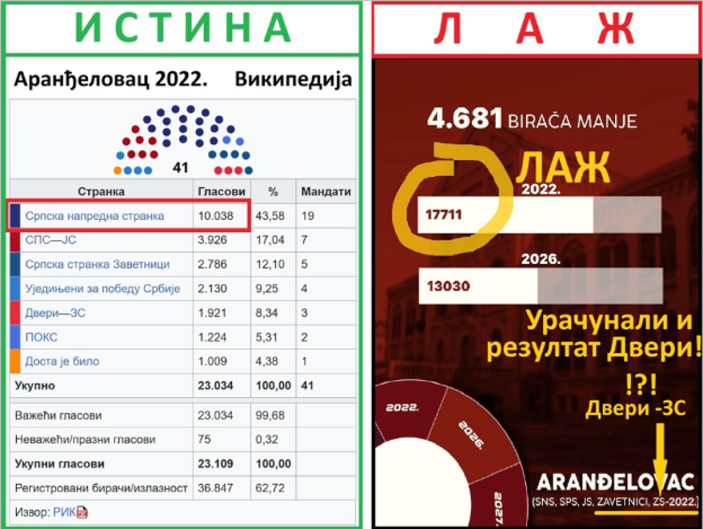 Aranđelovac. Ogromna laž i obmana blokadera FTN i NovaS se odnosi na Aranđelovac. Blokaderi FTN i NovaS su rezultatu SNS (10038 glasova), 2022. u Aranđelovcu, prevarantski dodali rezultate nesumnjivo opozicionih lista Dveri-Zdrava Srbija (1921 glas) i Zavetnika (2786 glasova). Setimo se ove opozicione stranke su 2022. više puta pretile smrću predsedniku Vučiću. To su bili glasovi protiv SNS u Aranđelovcu 2022. Drastična je obmana javnosti, te glasove dodati rezultatu SNS iz 2022. Blokaderi su slagali da je SNS imala 17711 glasova u Aranđelovcu 2022., a istina je da je SNS imao 10038 glasova. Sada SNS u Aranđelovcu ima 13030 glasova – 3000 glasova više nego 2022. Tu se ne radi čak ni o sabiranju baba i žaba od strane blokadera. Tu se radi o namernoj prevari od strane blokadera FTN, da bi pokušali da dokažu svoje laži. Pali su na ispitu. U Aranđelovcu SNS 2026. godine, ima 52,96%, a blokaderi i opozicija 44%.