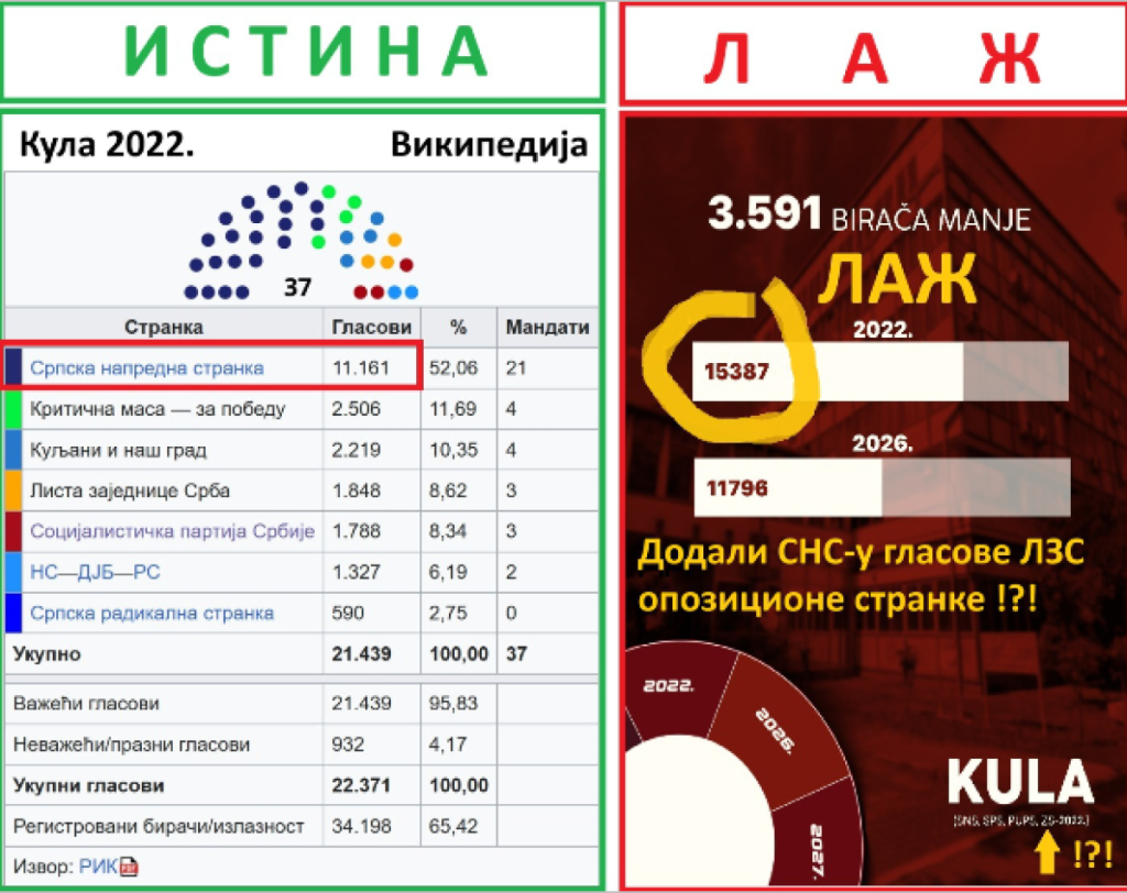 Kula. Naredna velika obmana blokadera FTN i NovaS se odnosi na Kulu. Blokaderi FTN i NovaS su rezultatu SNS, 2022. u Kuli, prevarantski dodali rezultat nesumnjivo opozicione liste u Kuli – liste „Zajednica Srba“, koja je dobila 1848 glasova 2022. godine. To su bili glasovi protiv SNS. Drastična je obmana javnosti, te glasove dodati rezultatu SNS iz 2022. Tu se ne radi čak ni o sabiranju baba i žaba. Tu se radi o namernoj prevari od strane blokadera FTN, da bi pokušali da dokažu svoje laži. Pali su na ispitu. U Kuli SNS 2026. godine, ima 50,52%, a blokaderi i opozicija 48%.