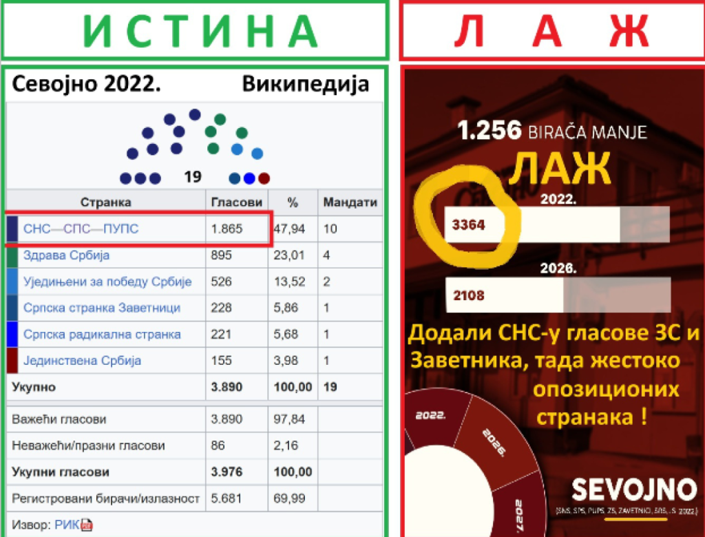 Sevojno. Još jedna velika obmana blokadera FTN i NovaS se odnosi na Sevojno. Blokaderi FTN i NovaS su rezultatu SNS-SPS-PUPS (1865 glasova), 2022. u Sevojnu, prevarantski dodali rezultate nesumnjivo opozicionih lista Zavetnika i Zdrave Srbije. Opoziciona Zdrava Srbija je u Sevojnu 2022. dobla 23 odsto, a Zavetnici gootovo 6 odsto glasova. To su bili glasovi protiv SNS. Drastična je obmana javnosti, te glasove dodati rezultatu SNS iz 2022. Blokaderi su slagali da je SNS imala 3364 glasa u Sevojnu 2022., a istina je da je koalicija SNS-SPS-PUPS ima 1865 glasova. Tu se ne radi čak ni o sabiranju baba i žaba. Tu se radi o namernoj prevari od strane blokadera FTN, da bi pokušali da dokažu svoje laži. Pali su na ispitu. U Sevojnu SNS 2026. godine, ima 51,5%, a blokaderi i opozicija 44,8%.