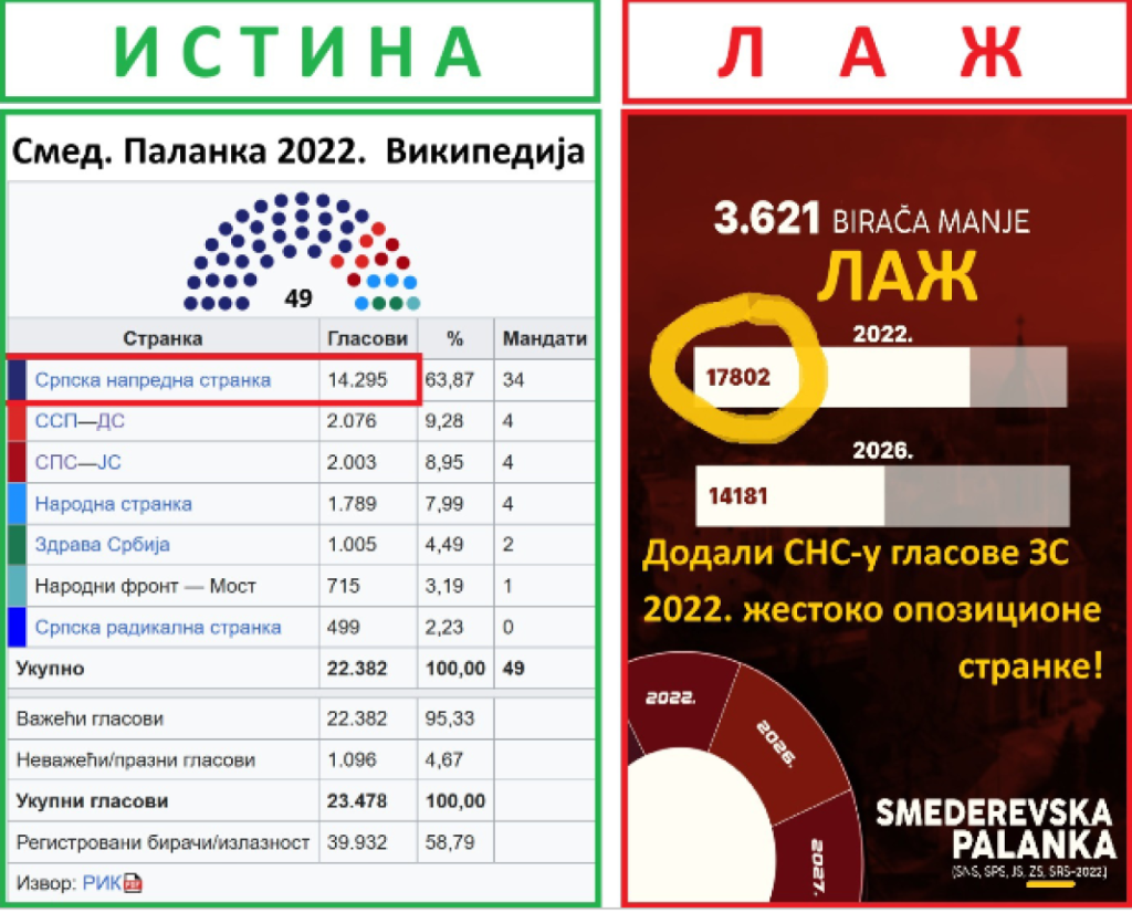 Smederevska Palanka. Sledeća velika obmana blokadera FTN i NovaS se odnosi na Smederevsku Palanku. Blokaderi FTN i NovaS su rezultatu SNS 2022. u Smederevskoj palanci, prevarantski dodali rezultat nesumnjivo opozicione liste Zdrave Srbije. Opoziciona Zdrava Srbija je u Smederevskoj Palanci 2022. dobila 1005. glasova. To su bili glasovi protiv SNS. Drastična je obmana javnosti, te glasove dodati rezultatu SNS iz 2022. Tu se ne radi čak ni o sabiranju baba i žaba. Tu se radi o namernoj prevari od strane blokadera FTN, da bi pokušali da dokažu svoje laži. Pali su na ispitu. U Smederevskoj Palanci SNS 2026. godine, ima 58%, a blokaderi 29% i opozicija 9,5%.