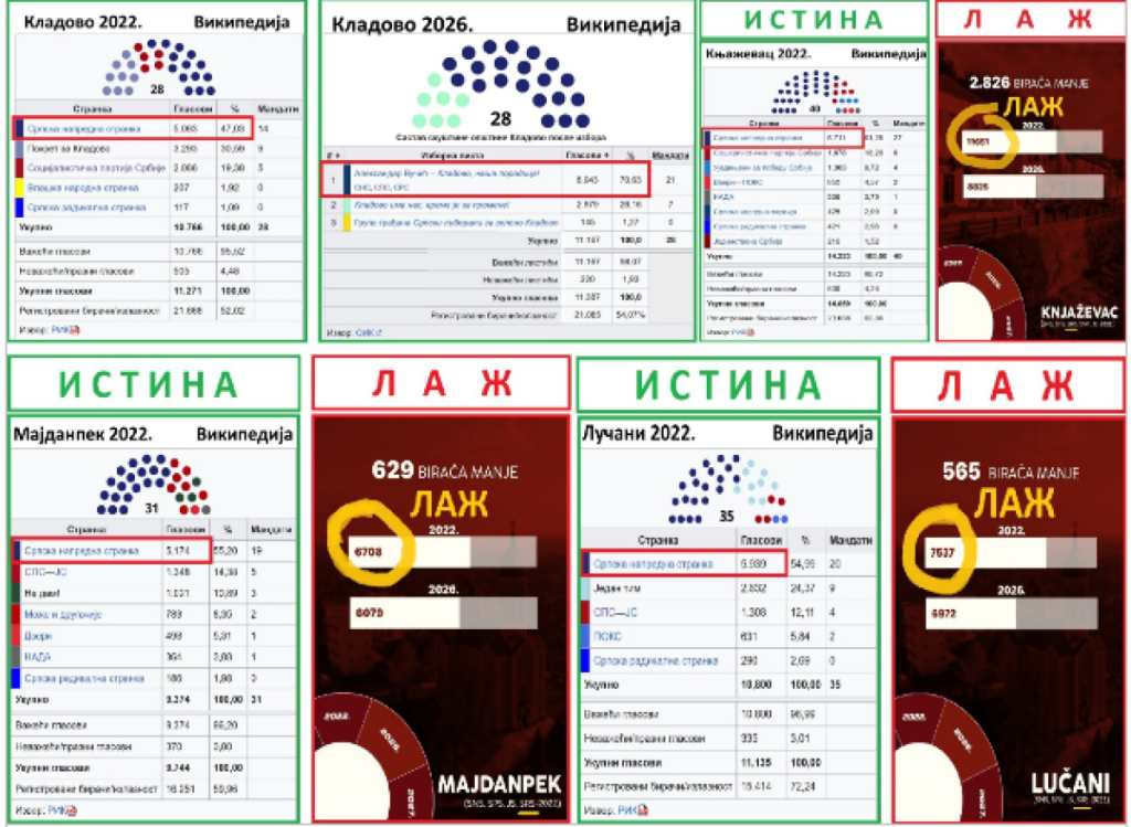 U tom obmanjujućem tekstu NoveS, punom glupih i očiglednih laži, stoji: „Studenti fakulteta tehničkih nauka objavili su koliko je SNS u broju glasova pao na tek održanim lokalnim izborima u 10 gradova i opština, u odnosu na izbore koji su održani 2022. godine. Tako je u Aranđelovcu Srpska napredna stranka 2022. godine osvojila 17.711 glasova, a 2026. je njen broj birača pao za 4.681 i sada iznosi 13.030. I u Smederevskoj Palanci je na ovim izborima vladajuća stranka osvojla 3. 621 glasova manje, jer je 2022. godine SNS imao 17.802 glasača, a sad ima 14.181. U Kuli (...) Kad se poredi sa izborima 2022. godine, vladajuća stranka izgubila 3.591 birača. Pala je sa 15.387 na 11.796 glasova. Veliki pad naprednjaci imaju i u Knjaževcu i Boru. Tako je u Knjaževcu 2022. godine SNS osvojio 11.651 glasova, a sada 8.825, što znači 2.826 birača manje. U Boru su u brojkama pali za 2.208, sa 14.724 pre četiri godine na 12.516 glasova, koliko su osvojili na tek završenim lokalnim izborima. U opštini Sevojno pad SNS iznosi 1.256, u Bajinoj Bašti su pali sa 10.154 na 8.950 glasova. U Majdanpeku su izgubili 629, a u Lučanima 565 glasova“.