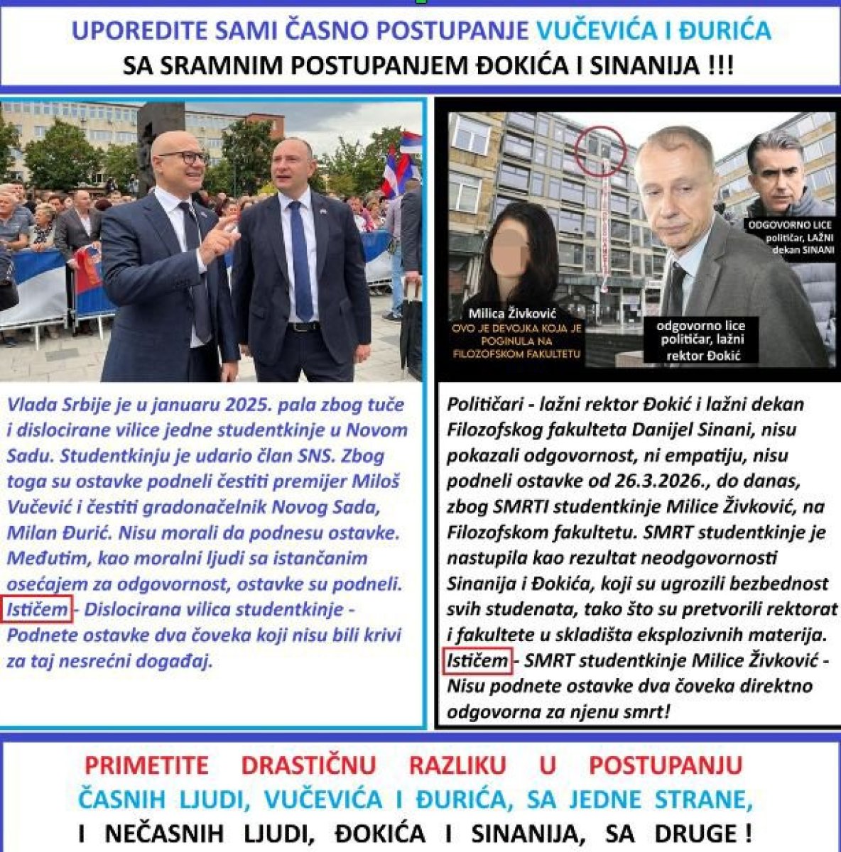 Uporedite sami, časno postupanje Miloša Vučevića i Milana Đurića, sa sramnim postupanjem Đokića i Sinanija. Primetite drastičnu razliku u postupanju časnih ljudi Vučevića i Đurića, i nečasnih ljudi Đokića i Sinanija. Vučević i Đurić su podneli ostavke zbog dislocirane vilice studentkinje. Vučević i Đurić nisu bili krivi za taj događaj. Đokić i Sinani nisu podneli ostavke zbog smrti studentkinje. Đokić i Sinani su direktno odgovorni za njenu smrt. Govorim o odgovornosti, a ne o krivici u krivično pravnom pogledu.