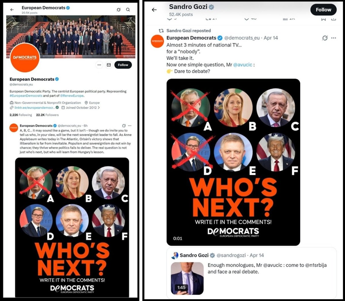 Rukavice su skinute. „Demokrate Evrope“ misle da je došlo njihovih pet minuta, i otvoreno prete liderima suverenistima, liderima slobodnog sveta. Demonokrate su krvožedne. Jednako ovako se ponašaju i opozicija i blokaderi u Srbiji. Oni Orbanov poraz prikazuju kao Vučićev poraz (!?!) i urliču – Vučiću ti si sledeći. Pri tome fašista Sandro Goci, poziva predsednika Vučića na TV duel na TVN1. TVN1 želi da ugosti fašistu Sandra Gocija, ne smeta im ružna fašistička prošlost fašiste Sandra Gocija, ali im smeta srpski predsednik Vučić, jedan od lidera slobodnog sveta!