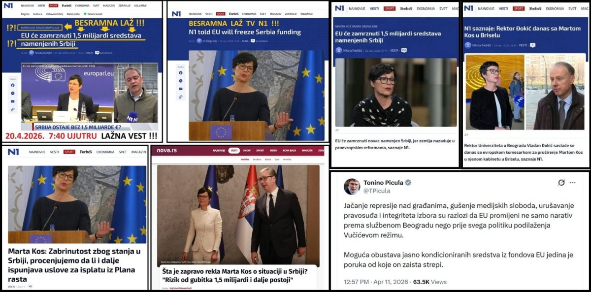 Opozicioni mediji, opozicija i blokaderi su 20.4.2026. lansirali spin, laž, o tome da će EU, baš 20.4.2026. zamrznuti 1,5 milijardi sredstava namenjenih Srbiji, i da će to komesarka EU Marta Kos, saopštiti 20.4.2026. godine. TV N1 je 20.4.2026. u 07:41 ujutru, objavila LAŽNU VEST sa namerom da uznemiri javnost, što predstavlja krivično delo. Nadnaslov vesti N1 je glasio: „Marta Kos danas objavljuje"! Naslov je glasio: „EU će zamrznuti 1,5 milijardi sredstava namenjenih Srbiji". Autor teksta je Nikola Radišić. U tekstu je naveden niz laži: „EU će zamrznuti novac namenjen Srbiji, jer zemlja nazaduje u proevropskim reformama, saznaje N1. To će Komesarka EU za proširenje Marta Kos i zvanično objaviti na današnjem sastanku Odbora za spoljne poslove Evropskog parlamenta (AFET). Država ostaje bez 1,5 milijardi evra iz takozvanog "Plana rasta" zbog kontroverznih pravosudnih reformi". Već sutradan se pokazalo da je vest POTPUNO LAŽNA! Istog dana u 16:21 N1 je počela da relativizuje svoju lažnu vest od 7:41 ujutru, i objavila je vest pod naslovom: „Marta Kos: Zabrinutost zbog stanja u Srbiji, procenjujemo da li i dalje ispunjava uslove za isplatu iz Plana rasta". Umesto kategorične laži od 7:41 da će Marta Kos objaviti da Srbiji zamrzava 1,5 milijardi evra, N1 u 16:21 kaže da je u pitanju ZABRINUTOST, i da EU samo PROCENJUJE celo pitanje. To je sasvim drugačije od lažne vesti objavljene u 7:41. Dakle, prvo je N1 sama sebe demantovala, a potom je naredni dan, 21.4.2026. dokazao da je N1 u 7:41 objavila LAŽNU VEST! Foto: printscreen