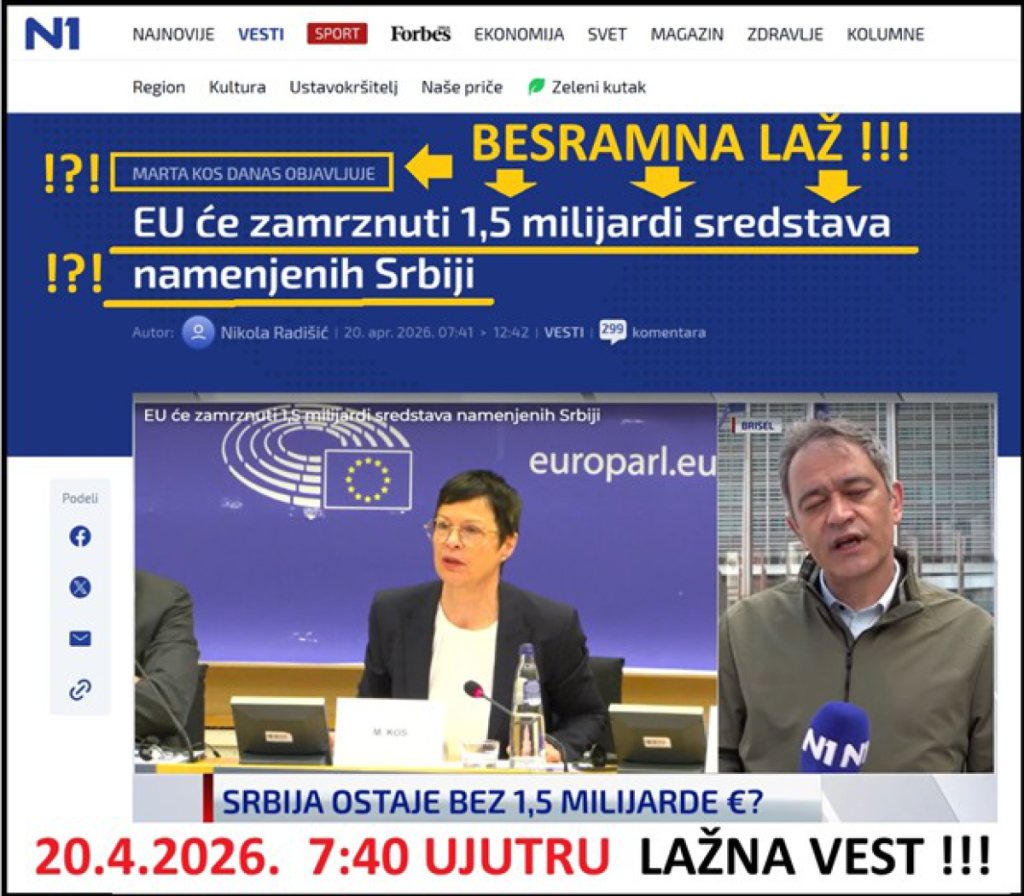 Opozicioni mediji, opozicija i blokaderi su 20.4.2026. lansirali spin, laž, o tome da će EU, baš 20.4.2026. zamrznuti 1,5 milijardi sredstava namenjenih Srbiji, i da će to komesarka EU Marta Kos, saopštiti 20.4.2026. godine. TV N1 je 20.4.2026. u 07:41 ujutru, objavila LAŽNU VEST sa namerom da uznemiri javnost, što predstavlja krivično delo. Nadnaslov vesti N1 je glasio: "Marta Kos danas objavljuje"! Naslov je glasio: "EU će zamrznuti 1,5 milijardi sredstava namenjenih Srbiji“. U tekstu je naveden niz laži: "EU će zamrznuti novac namenjen Srbiji, jer zemlja nazaduje u proevropskim reformama, saznaje N1. To će Komesarka EU za proširenje Marta Kos i zvanično objaviti na današnjem sastanku Odbora za spoljne poslove Evropskog parlamenta (AFET). Država ostaje bez 1,5 milijardi evra iz takozvanog "Plana rasta" zbog kontroverznih pravosudnih reformi". Već sutradan se pokazalo da je vest potpuno lažna! Istog dana, kada je lansirana lažna vest, 20.4.2026. u 16:21 časova, N1 je počela da relativizuje svoju lažnu vest od 7:41 ujutru, i objavila je vest pod naslovom: "Marta Kos: Zabrinutost zbog stanja u Srbiji, procenjujemo da li i dalje ispunjava uslove za isplatu iz Plana rasta". Umesto kategorične laži od 7:41 da će Marta Kos objaviti da Srbiji zamrzava 1,5 milijardi evra, N1 u 16:21 kaže da je u pitanju ZABRINUTOST, i da EU samo PROCENJUJE celo pitanje. To je sasvim drugačije od lažne vesti objavljene u 7:41. Dakle, prvo je N1 sama sebe demantovala, a potom je naredni dan, 21.4.2026. dokazao da je N1 u 7:41 objavila LAŽNU VEST! Marta Kos NIJE objavila da će EU zamrznuti 1,5 milijardi sredstava namenjenih Srbiji! Država NIJE ostala bez 1,5 milijardi evra iz takozvanog "Plana rasta"! Danas, šest dana posle te lažne vesti, pokazalo se da nikakva sredstva za Srbiju nisu zamrznuta, niti postoji namera da EU to uradi. Iako je uhvaćen u laži, N1 nije uputio izvinjenje javnosti, iako pravila profesionalnog novinarstva to zahtevaju.