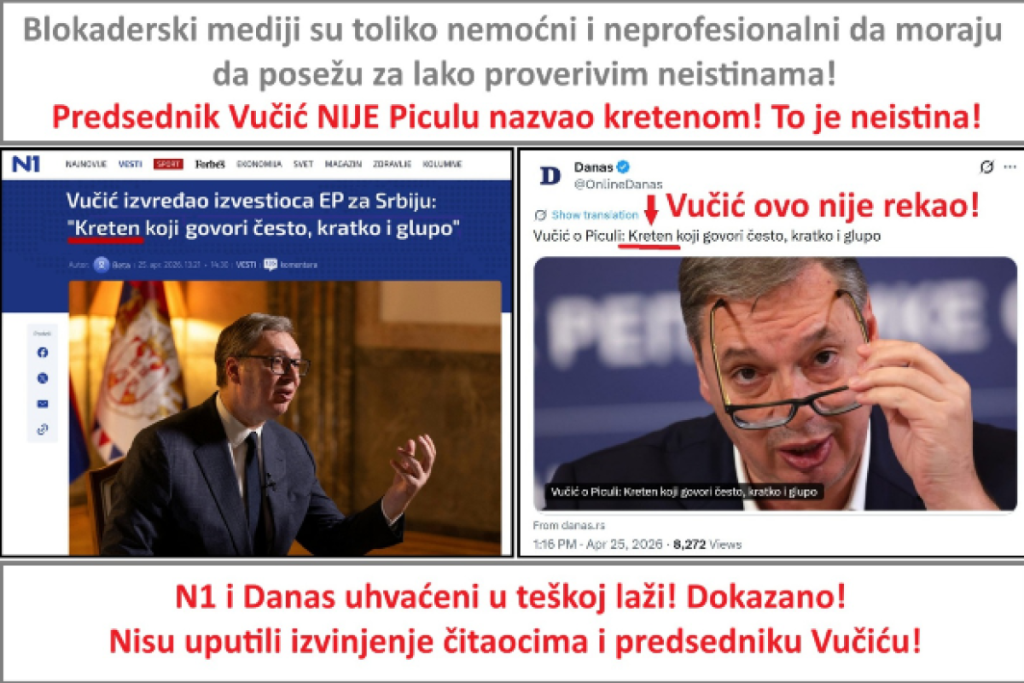 Antimediji, simboli neprofesionalnosti, antinovinarstva, promoteri mržnje i nasilja, N1 i Danas, su toliko nemoćni i neprofesionalni, da su 25.4.2026. posegli za lako proverivim neistinama. Oni su tog dana predsedniku Vučiću stavili reči u usta, izmislili su da je predsednik Vučić, Tonina Piculu nazvao kretenom. Potpuno izmislili! Lansirali lažnu vest. Predsednik Vučić je o Piculi rekao: "Što se tiče glupih poruka, on govori često, ali obično je to kratko i glupo". N1 i Danas su potpuno izmenili reči predsednika Vučića i podmetnuli reč "kreten". Kada ovi neljudi iz antimedija ovako drsko podmeću laži predsedniku Srbije, zamislite kakve tek laži objavljuju u ostalim slučajevima! Iako su uhvaćeni u laži, N1 i Danas nisu uputili izvinjenje javnosti i predsedniku Vučiću, iako pravila profesionalnog novinarstva to zahtevaju. Nije se oglasio ni novi urednik N1, Branislav Šovljanski, koji je svoj drugi radni dan na mestu urednika N1, započeo lansiranjem veoma glupe lažne vesti.