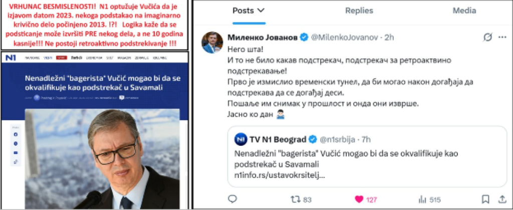 Već narednog dana, 26.4.2026., N1 je lansirao zaista debilnu lažnu vest pod naslovom: "Nenadležni "bagerista" Vučić mogao bi da se okvalifikuje kao podstrekač u Savamali". U tekstu napisanom 26.4.2026. godine, N1 komentariše izjavu predsednika Vučića iz 2023. godine, i optužuje Vučića da je izjavom datom 2023. godine, nekoga podstakao na neko imaginarno krivično delo, počinjeno 10 godina ranije, 2013. godine!!! Neverovatno! I deca u osnovnoj školi znaju da se podsticanje može izvršiti pre učinjenog dela, a ne posle. Elementarna logika. Ne postoji retroaktivno podstrekivanje. Vest N1 liči na neku izvrnutu i ludačku verziju filmova "Povratak u budućnost" ("Back to the future") ili izvrnutu verziju knjige H.DŽ. Velsa "Vremeplov" ("The Time Machine"), gde se Vučić vraća u prošlost 10 godina, da bi nekoga podstakao na neko delo, a potom se vraća 10 godina u budućnost. Na idiotizam vesti N1, je 26.4.2026. prvi je ukazao šef poslaničkog kluba SNS u Skupštini Srbije, i član predsedništva SNS, Milenko Jovanov, koji je na platformi "X" lakonski napisao: "Nego šta! I to ne bilo kakav podstrekač, podstrekač za retroaktvino podstrekavanje! Prvo je izmislio vremenski tunel, da bi mogao nakon događaja da podstrekava da se događaj desi. Pošalje im snimak u prošlost i onda oni izvrše. Jasno ko dan". Zbog lažne i nelogične vesti da je Vučić podstrekač rušenja u Savamali, N1 nije uputio izvinjenje javnosti i predsedniku Vučiću, iako pravila profesionalnog novinarstva to zahtevaju. Nije se oglasio ni novi urednik N1, Branislav Šovljanski, koji je svoj treći radni dan na mestu urednika N1, započeo lansiranjem veoma glupe lažne vesti.