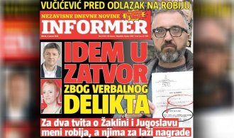 Ako već niste čuli, da objasnim. Dobio sam poziv za 'izvršenje zatvorske kazne'. Piše tamo, evo vam faksimil, pa pogledajte: 'Nalaže se Vučićević Draganu od oca Jola iz Beograda... i upućuje se da se na dan 3. 4. 2023. godine javi u Okružni zatvor Beograd radi izdržavanja kazne zatvora koja mu je izrečena presudama:...". I eto, za manje od deset dana, umesto u Informeru, moći ću da pišem samo po zidu ćelije u Bačvanskoj!