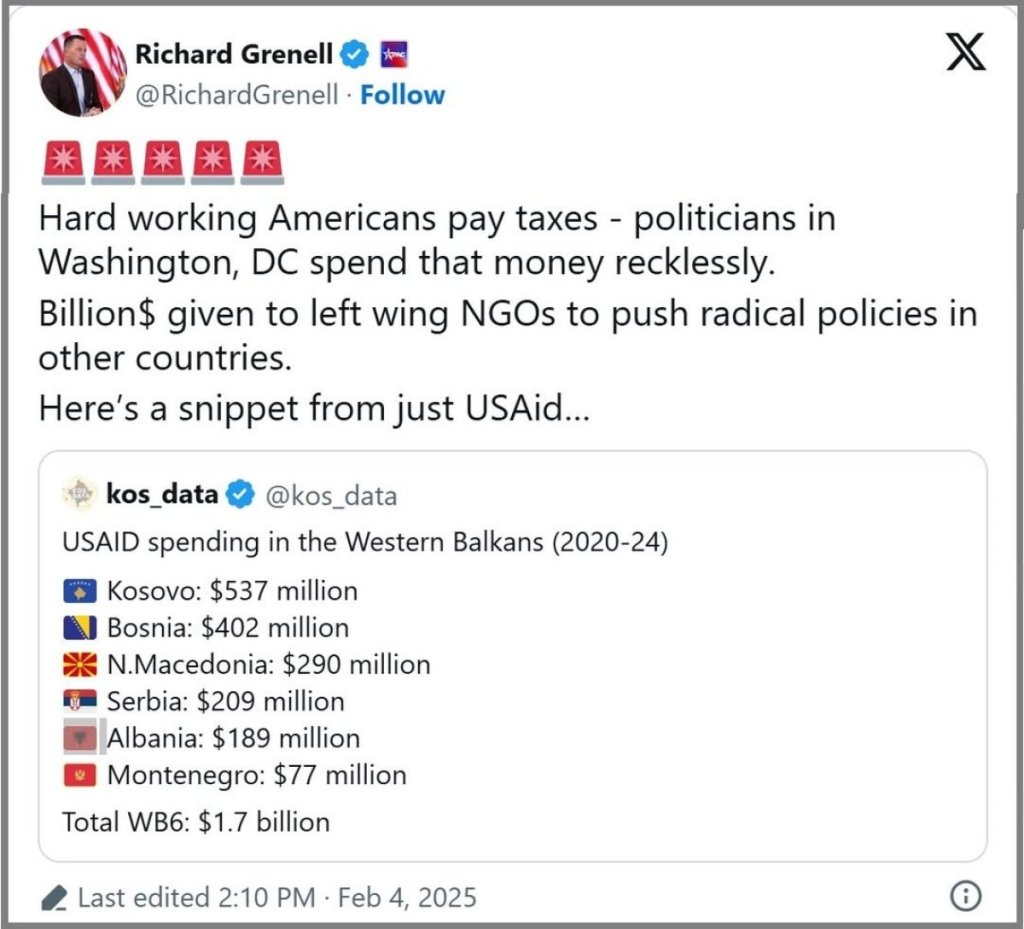 Kada govorimo o novcu koji je uložen u rušenje Vučiča, evo najupečatljivijeg dokaza. Ričard Grenel, zvaničnik SAD, je 4.2.2025. rekao: „Vredni Amerikanci plaćaju porez, a političari u Vašingtonu nesmotreno troše taj novac. Milijardu dolara dato je levičarskim nevladinim organizacijama za sprovođenje radikalne politike u drugim zemljama. Evo isečka samo iz USAID". Grenel je govorio o delu novca koji je uložen protiv Srbije i Vučića. Grenel je rekao, citiram: „USAID je na Zapadnom Balkanu potrošio - na Kosovu 537 miliona dolara, u Bosni 402 miliona, u Srbiji 209 miliona dolara, u Albaniji 189 miliona, i u Crnoj Gori 77 miliona dolara. Ukupno 1,7 milijardi dolara od 2020. do 2024. godine". Kraj citata. Toliko novca je samo Bajdenov USAID uložio protiv Srbije i Vučića. A ulagali su i NED, Stejt dipartment, desetine vladinih organizacija iz Evrope, i stotine privatnih fondacija iz SAD i Evrope. Radi se o milijardama dolara ili evra, za 5 godina, koje su uložene u rušenje Vučića i u destabilizaciju Srbije.