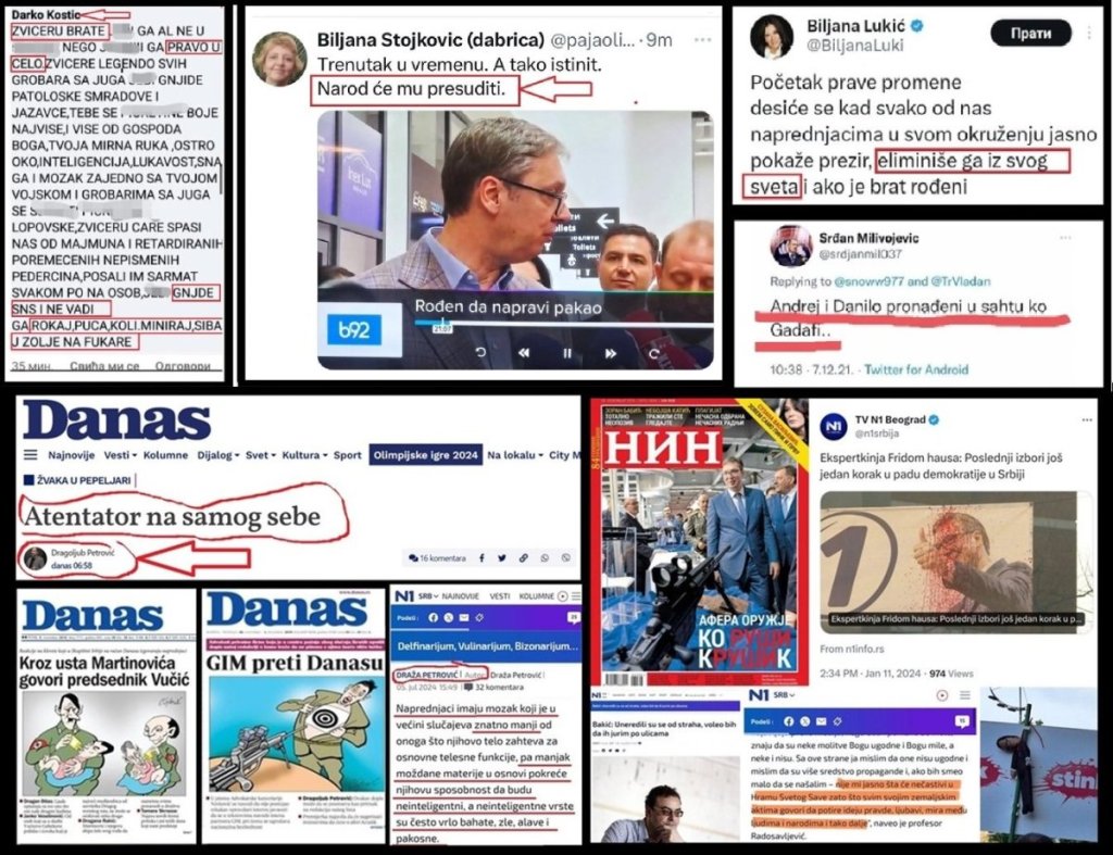Setimo se sistematske dehumanizacije predsednika Vučića i njegove porodice, koja traje 10 godina. Setimo se kriminalizacije predsednika Vučića i njegove porodice, koja prati dehumanizaciju. Namera opozicije i Šolakovih medija, i naših neprijatelja iz regiona, je da posle dehumanizacije i kriminalizacije, usledi likvidacija predsednika Vučića. Setimo se stalnih pretnji smrću koje su upućene predsedniku Vučiću i članovima njegove porodice. Pretnje smrću predsedniku Vučiću i njegovoj porodici, su postale svakodnevica, i to od javnih ličnosti! Ne prete samo anonimusi, već pretnje smrću dolaze od javnih ličnosti i lica koja nisu nepoznata. Poremećeni prete ubijanjem i bacanjem u šahte, prete jurenjem po ulicama, bacanjem u reke, vešanjem na trgovima, sudovima revolucije, tuširanjem uranijumom, potapanjem u sumpornu kiselinu… Kažu, da mi naprednjaci imamo male mozgove, da smo neinteligentni, bahati i zli, da smo niža rasa, podljudi, i da zbog toga oni „elita" i „nadljudi" imaju pravo da nas eliminišu. Prete nemoćni fašisti, isplaženih jezika, dahću žedni krvi, iskeženi, bezumni. Setimo se koje su sve gadosti govorili Srđan Milivojević, Marko Vidojković, Nenad Kulačin, Ćuta, Lazović, Milovan Brkić, Jovo Bakić, Srđan Škoro, Preković, Nogo i drugi… Sve nekažnjeno!