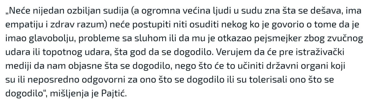 - Neće nijedan ozbiljan sudija postupiti niti osuditi nekog ko je govorio o tome da je imao glavobolju, probleme sa sluhom ili da mu je otkazao pesmejker zbog zvučnog ili toplotnog udara. Verujem da će pre istraživački mediji da nam objasne šta se dogodilo , nego što će to utvrditi državni organi - ustvrdio je Pajtić.