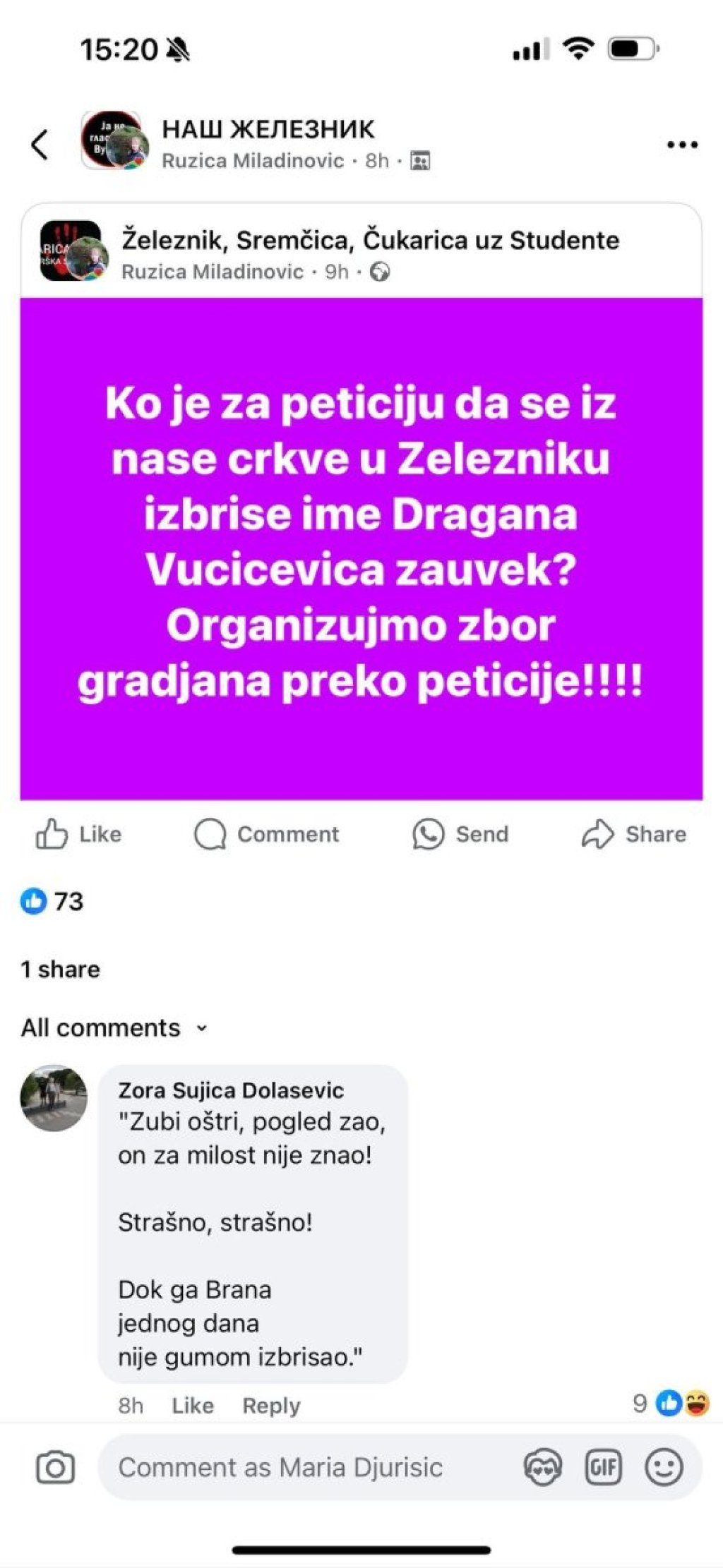 Na društvenim mrežama pojavili su se užasni predlozi da se Vučićević "zauvek izbriše iz Crkve". Ova užasna poruka objavljena je na Fejbuk stranici "Naš Železnik".