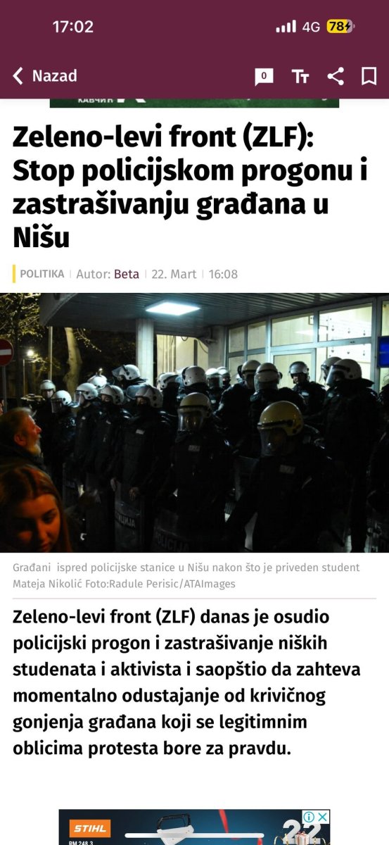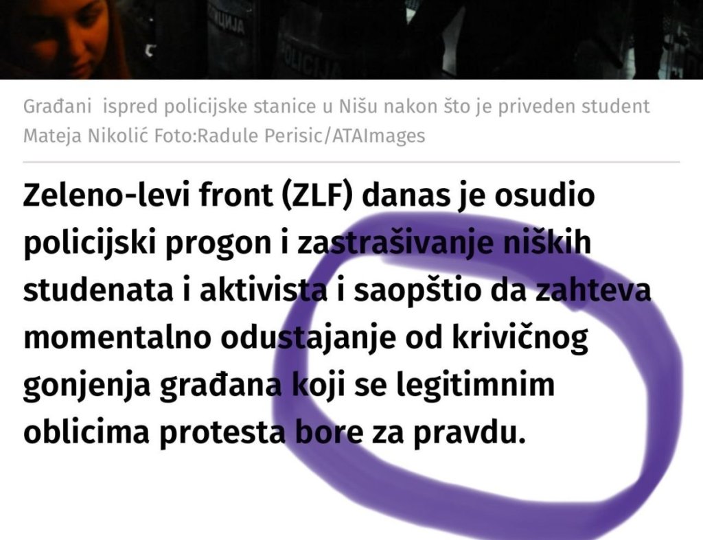 - Zeleno-levi front (ZLF) danas je osudio policijski progon i zastrašivanje niških studenata i aktivista i saopštio da zahteva momentalno odustajanje od krivičnog gonjenja građana koji se legitimnim oblicima protesta bore za pravdu - navodi se u saopštenju ZLF koji je preneo tajkunski portal.