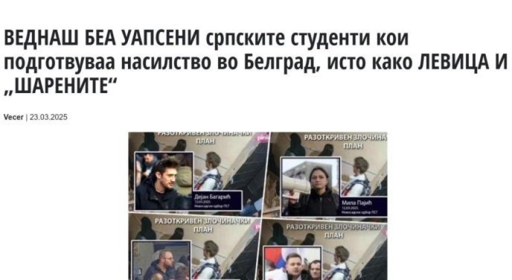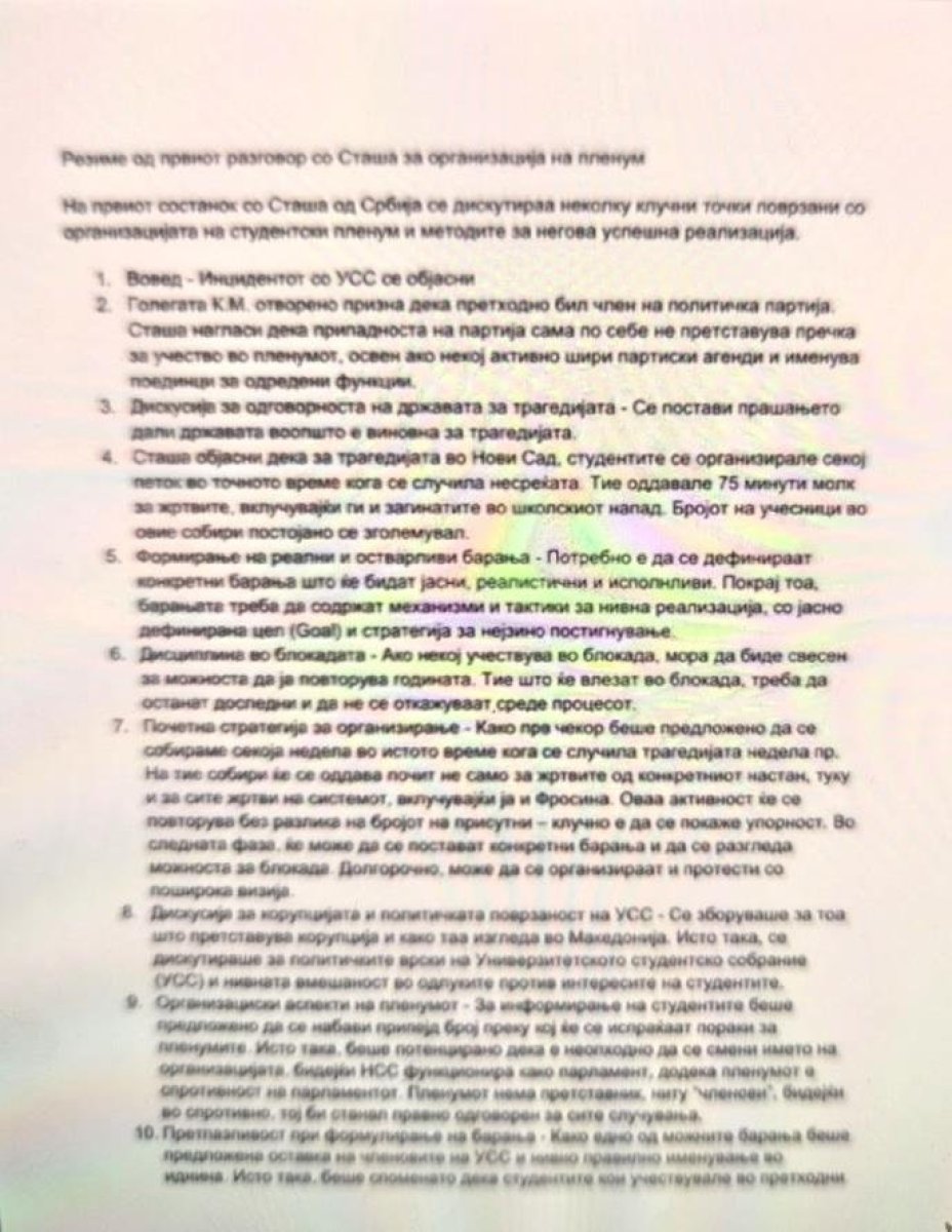 - Već sada je jasno da lideri protesta ulaze iz Srbije, neki su zaustavljeni juče na graničnom prelazu Tabanovce. Drugi su već ovde. Drugi, koji su se školovali u Srbiji i koji su se vratili, dobili su izveštaj od 20 stranica o tome kako da se organizuju studentski i srednjoškolski plenumi, kako da se izazovu incidenti, ko treba kakve izjave da daje medijima, kako da se odbije komunikacija sa institucijama... Sve piše crno na belo - navodi se detaljno u članku koji je objavio makedonski portal Večer.