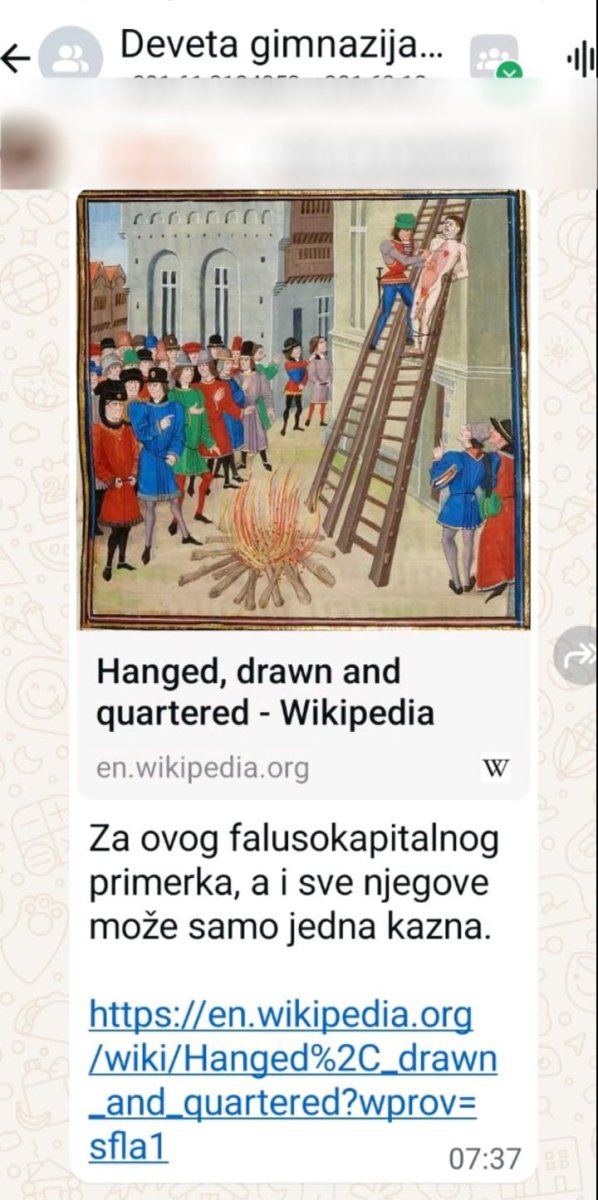Roditelji Devete beogradske gimnazije među sobom na grupama šalju razne poruke, a ona koja je osvanula u jednoj od grupa je u najmanju ruku monstruozna i predstavlja ozbiljnu pretnju koja zaslužuje pažnju državnih organa.