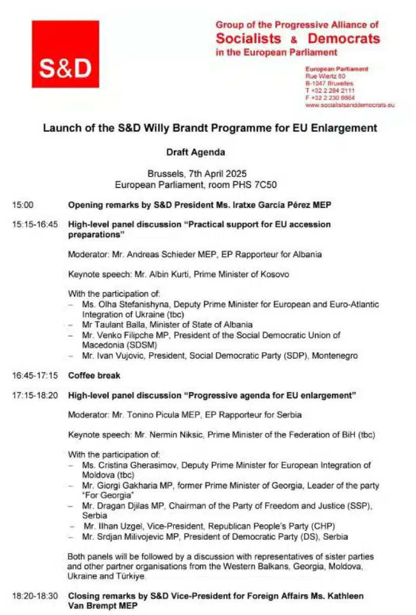 Agenda konferencije otkriva nam da je moderator jednog od panela poslanik u Evropskom parlamentu i izvestilac ovog tela za Albaniju, Andreas Šider, dok je glavni govornik ni manje ni više nego Aljbin Kurti, čija stranka "Samoopredeljenje" je takođe član grupacije Progresivni savez socijalista i demokrata.