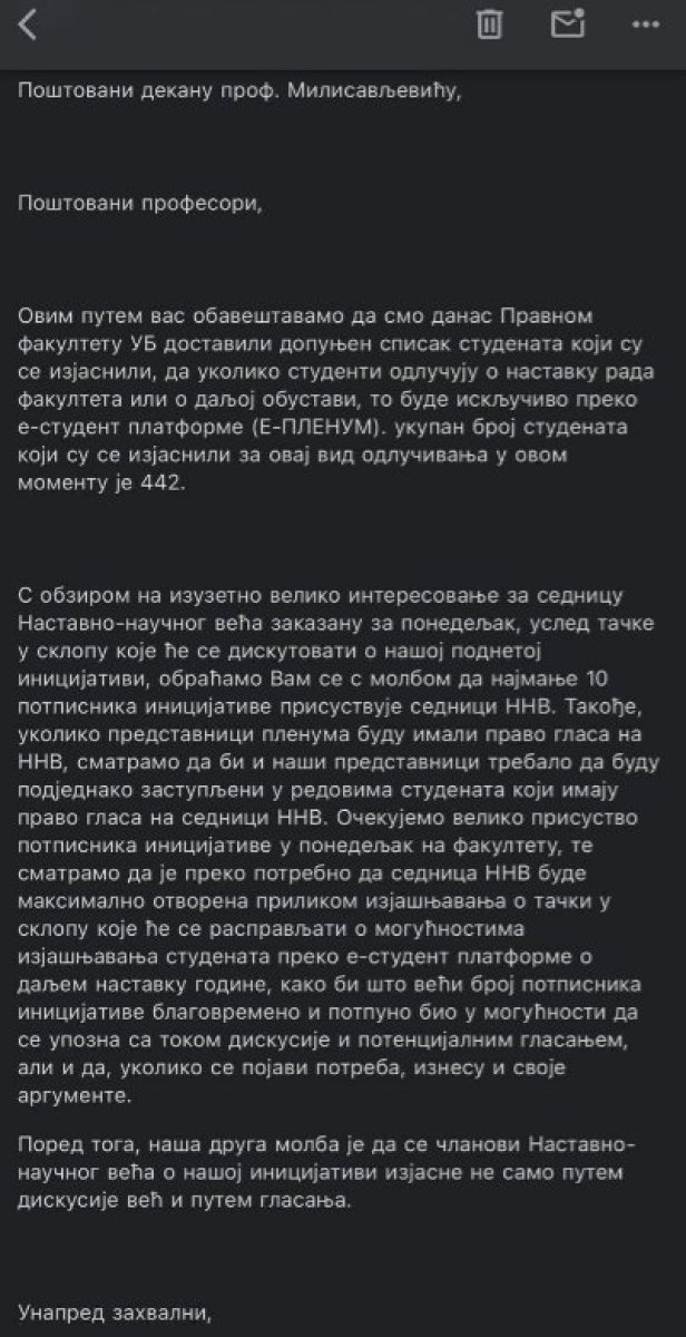 Ovim putem vas obaveštavamo da smo danas Pravnom fakultetu UB dostavili dopunjen spisak studenata koji su se izjasnili, da ukoliko studenti odlučuju o nastavku rada fakulteta ili o daljoj obustavi, to bude isključivo preko e-student platforme (E-PLENUM). Ukupan broj studenata koji su se izjasnili za ovaj vid odlučivanja u ovom momentu je 442. S obzirom na izuzetno veliko interesovanje za sednicu Nastavno-naučnog veća zakazanu za ponedeljak, usled tačke u sklopu koje će se diskutovati o našoj podnetoj inicijativi, obraćamo Vam se s molbom da najmanje 10 potpisnika inicijative prisustvuje sednici NNV'', navodi se, između ostalog u pismu.