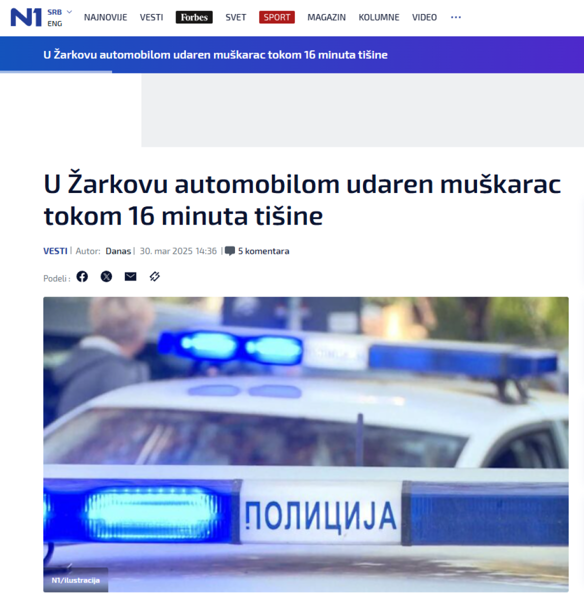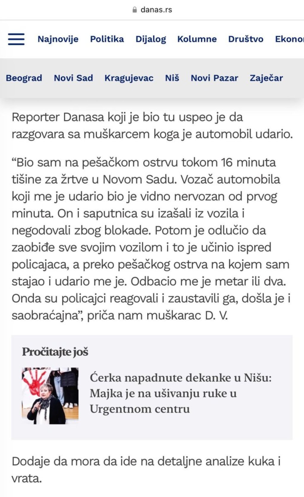 Molim ljude da pažljivo pročitaju vest objavljenu na svim tajkunskim medijima (N1, Nova, Danas i sl.) koji svojim svakodnevnim, stalnim lažima "pumpaju" mržnju u nadi da će izazvati građanski rat u Srbiji. Na ovom primeru videćete kakvu besomučnu i besramnu kampanju laži oni sprovode godinama, a posebno poslednjih meseci. Vest sa Danas, N1, Nova: U beogradskoj opštini Čukarica, danas je vozilom udaren muškarac tokom 16 minuta tišine za žrtve pada nadstrešnice u Novom Sadu, saznaje Danas. Incident se dogodio u Trgovačkoj ulici. Policija je bila prisutna, tako da su i vozač i oštećeni odvedeni u policijsku stanicu Čukarica, piše Danas. Reporter Danasa koji je bio tu uspeo je da razgovara sa muškarcem koga je automobil udario. “Bio sam na pešačkom ostrvu tokom 16 minuta tišine za žrtve u Novom Sadu. Vozač automobila koji me je udario bio je vidno nervozan od prvog minuta. On i saputnica su izašali iz vozila i negodovali zbog blokade. Potom je odlučio da zaobiđe sve svojim vozilom i to je učinio ispred policajaca, a preko pešačkog ostrva na kojem sam stajao i udario me je. Odbacio me je metar ili dva. Onda su policajci reagovali i zaustavili ga, došla je i saobraćajna”, priča nam muškarac D. V. Dodaje da mora da ide na detaljne analize kuka i vrata. “Video me je ispred sebe i uprkos policajacima krenuo na mene sa namerom i predoumišljajem”, kaže D. V. Podsetimo, na istom mestu je 15. marta udarena žena. DAKLE: UDAREN JE MUŠKARAC, LETEO JE METAR ILI DVA, MORA DA IDE NA DETALJNE ANALIZE KUKA I VRATA. A šta je istina, videćete u mojoj sledećoj objavi. Za sada iskoristite par minuta da se stavite u položaj ljudi koji od medija prate samo tajkunske medije i za drugu "istinu" ne znaju.