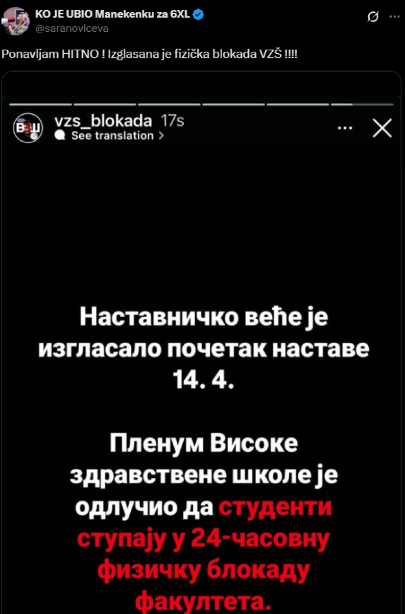 Nastavničko veće Visoke zdravstvene škole izglasalo je prekid blokade te ustanove kako bi njihovi studenti mogli da nastave godinu i samim tim je završe u predviđeno vreme. Međutim, nekima ne odgovara normalizacija stanja na VZŠ, pa su se odlučili na radikalne mere.