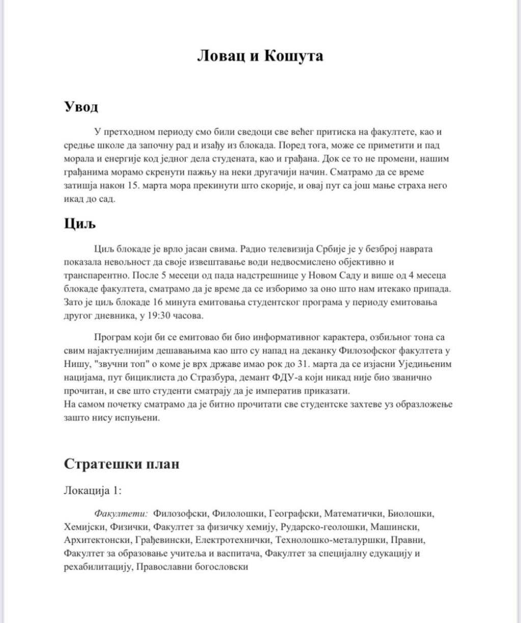 Kako je objasnio Vučićević na Informer televiziji, teroristički plan čiji je cilj upad u RTS nazvan je "Lovac i košuta" i blokaderi su pokušali da ga drže u strogoj tajnosti.