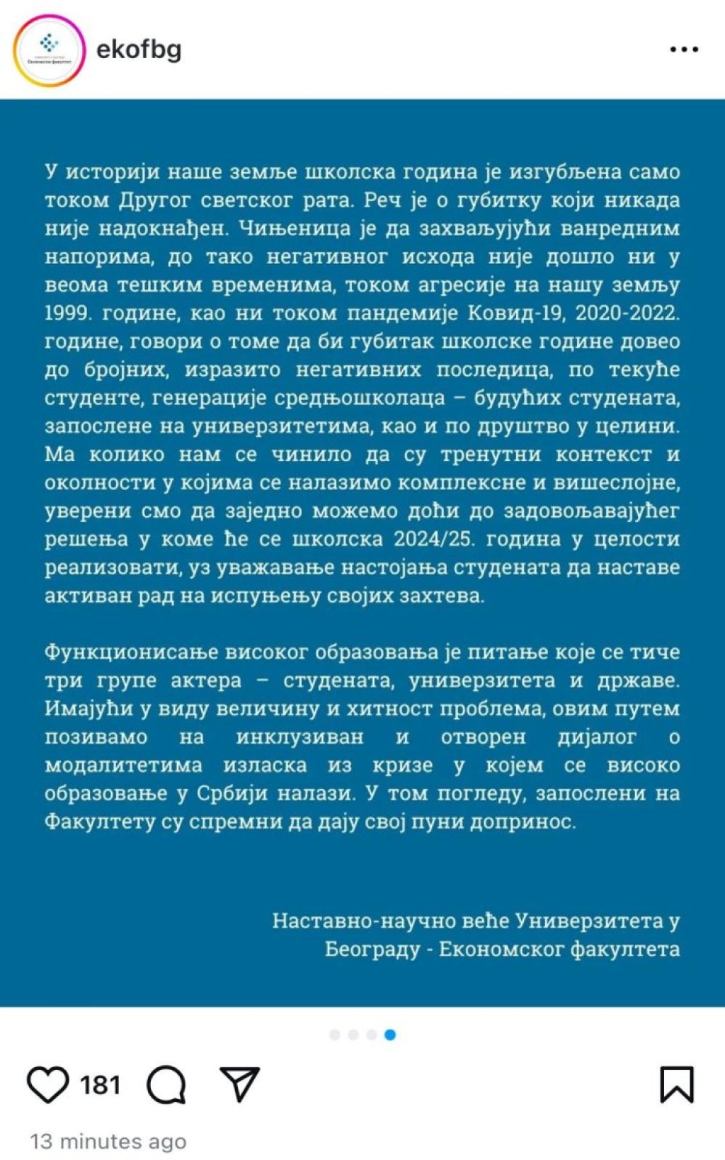 - Studenti koji žele da uče i studenti Ekonomskog fakulteta Univerziteta u Beogradu danas su imali sastanak sa dekanskim kolegijumom tog fakulteta. To je prvi razgovor za nas od kada traju blokade. Nadamo se da je to prvi korak ka cilju, a to je povratak svih studenata na fakultete - saopštili su.