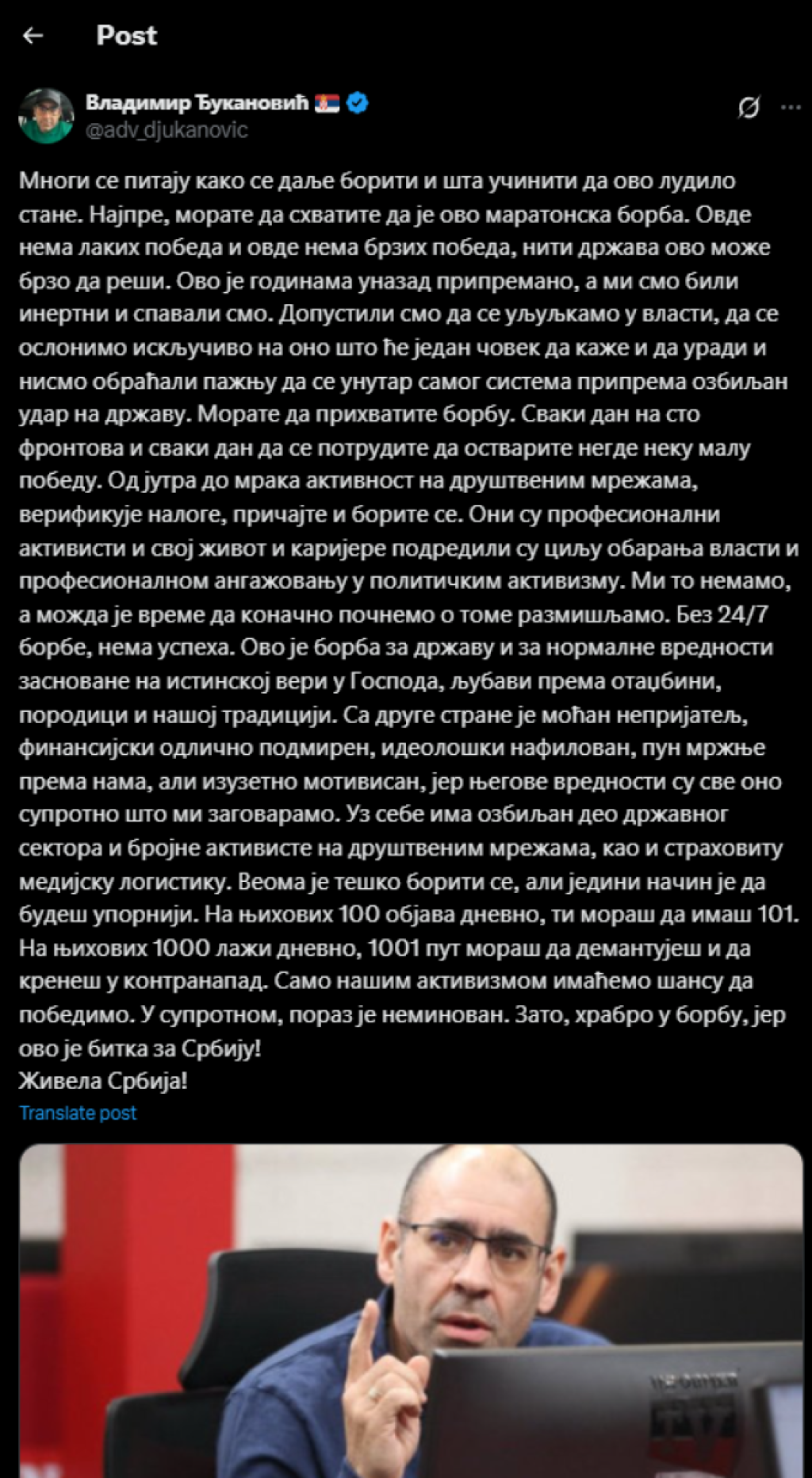 - Sa druge strane je moćan neprijatelj, finansijski odlično podmiren, ideološki nafilovan, pun mržnje prema nama, ali izuzetno motivisan, jer njegove vrednosti su sve ono suprotno što mi zagovaramo. Uz sebe ima ozbiljan deo državnog sektora i brojne aktiviste na društvenim mrežama, kao i strahovitu medijsku logistiku. Veoma je teško boriti se, ali jedini način je da budeš uporniji. Na njihovih 100 objava dnevno, ti moraš da imaš 101. Na njihovih 1000 laži dnevno, 1001 put moraš da demantuješ i da kreneš u kontranapad. Samo našim aktivizmom imaćemo šansu da pobedimo. U suprotnom, poraz je neminovan. Zato, hrabro u borbu, jer ovo je bitka za Srbiju! Živela Srbija! - napisao je Đukanović.