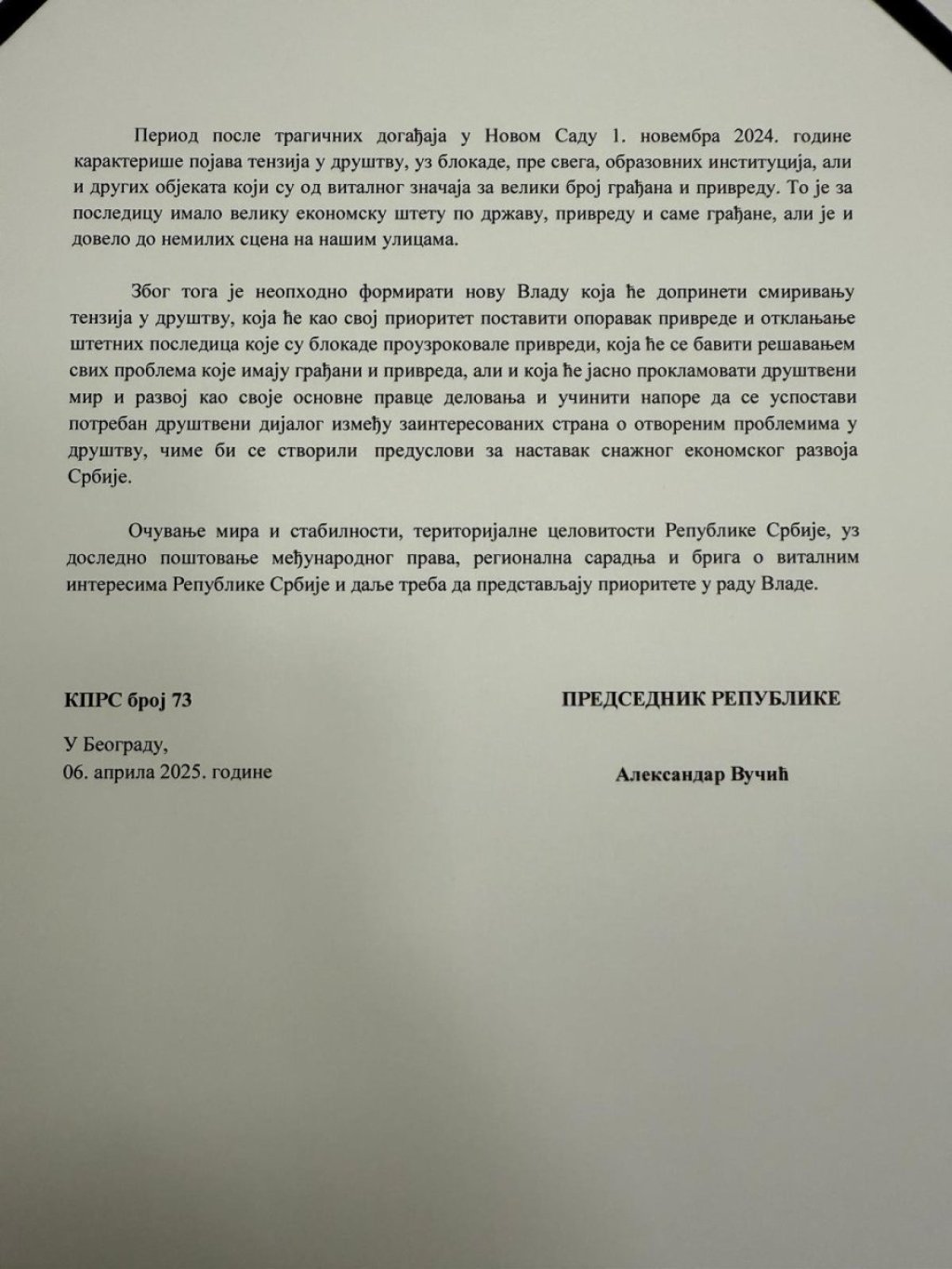 Predsednik Republike Srbije Aleksandar Vučić saopštiće ime mandatara za novu vladu danas u 20 časova, saopštila je Služba za saradnju sa medijima predsednika Republike.