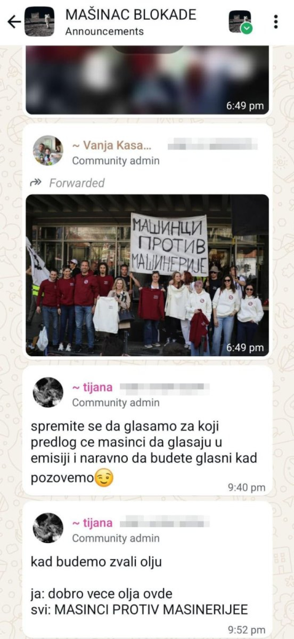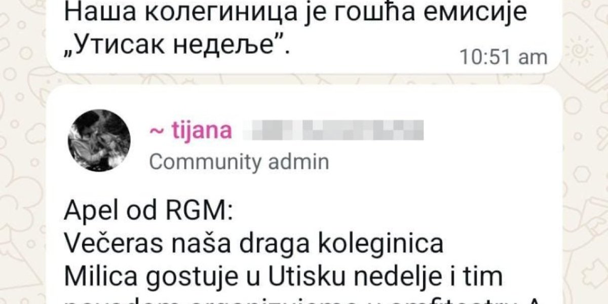 Jedna od blokadera najavila je u grupi gostovanje njihove koleginice u "Utisku" i predložila ostalima da se uključe u program kako bi "pozdravili Olju i glasali za predlog".