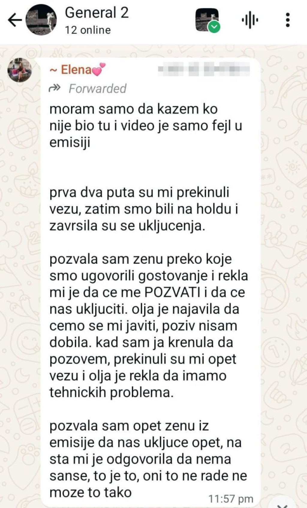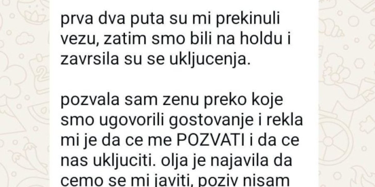 - Pozvala sam ženu preko koje smo ugovorili gostovanje i rekla mi je da će me pozvati i da će nas uključiti. Olja je najavila da ćemo se mi javiti, poziv nisam dobila. Kad sam ja krenula da pozovem, prekinuli su mi opet vezu i Olja je rekla da imamo tehničkih problema. Pozvala sam opet ženu iz emisije da nas uključe ponovo, na šta mi je odgovorila da nema šanse, to je to, oni to ne rade, ne može to tako - konstatovala je vidno razočarana blokaderka.
