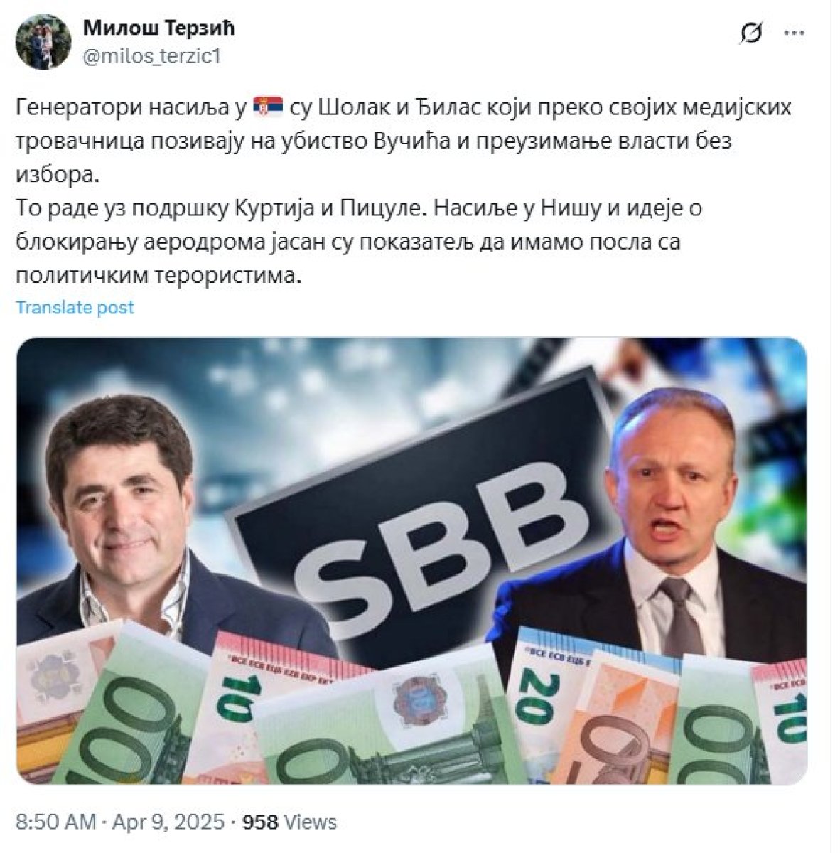 ''Generatori nasilja u Srbiji su Šolak i Đilas koji preko svojih medijskih trovačnica pozivaju na ubistvo Vučića i preuzimanje vlasti bez izbora. To rade uz podršku Кurtija i Picule. Nasilje u Nišu i ideje o blokiranju aerodroma jasan su pokazatelj da imamo posla sa političkim teroristima'', napisao je Terzić na mreži Iks.