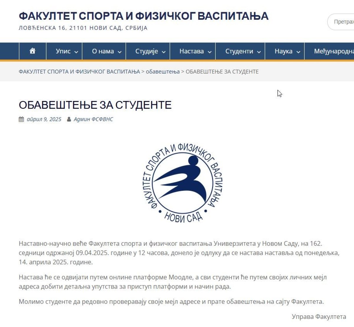 Nastavno-naučno veće Fakulteta sporta i fizičkog vaspitanja tražilo je da je od svakog nastavnika da se jasno izjasni da li je za započinjanje nastave ili za nastavak blokade.