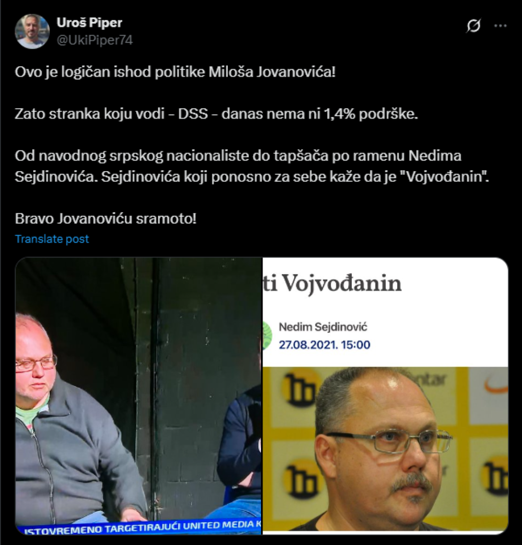 - Ovo je logičan ishod politike Miloša Jovanovića! Zato stranka koju vodi - DSS - danas nema ni 1,4% podrške. Od navodnog srpskog nacionaliste do tapšača po ramenu Nedima Sejdinovića. Sejdinovića koji ponosno za sebe kaže da je "Vojvođanin". Bravo Jovanoviću sramoto! - napisao je Piper.