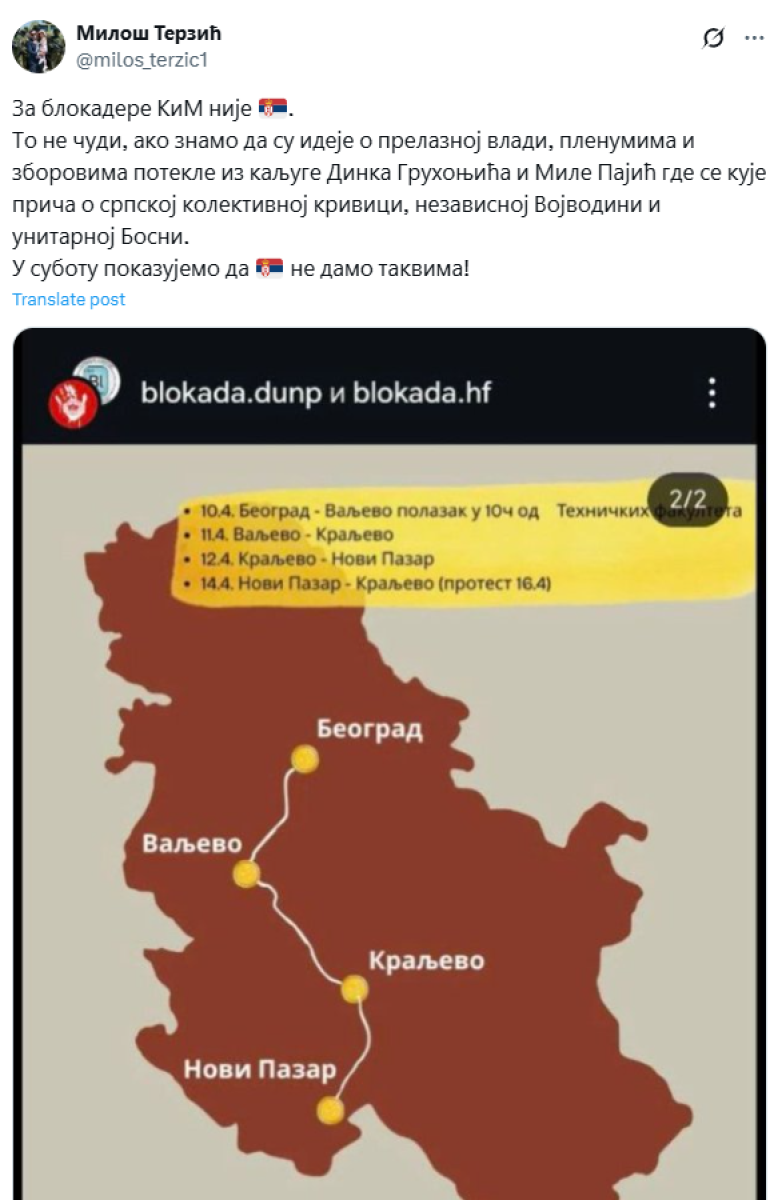 - Za blokadere KiM nije Srbija. To ne čudi, ako znamo da su ideje o prelaznoj vladi, plenumima i zborovima potekle iz kaljuge Dinka Gruhonjića i Mile Pajić gde se kuje priča o srpskoj kolektivnoj krivici, nezavisnoj Vojvodini i unitarnoj Bosni. U subotu pokazujemo da Srbiju ne damo takvima - poručio je Terzić.