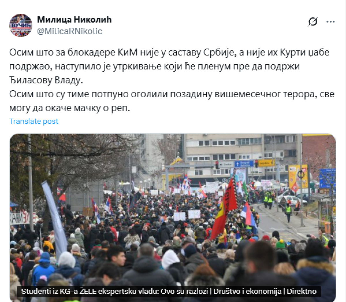 Članica Predsedništva SNS Milica Nikolić poručila je da nije ništa slučajno i džabe što je studente blokadere podržao premijer lažne države Aljbin Kurti.