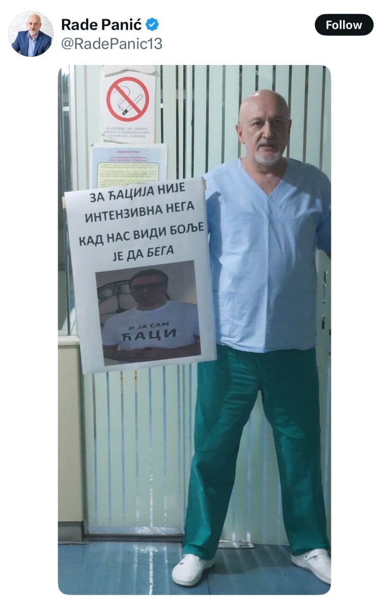 Panić je, naime, objavio skandaloznu fotografiju na kojoj je ispisano isto ono što su i Dejan Pantić, načelnik neonatologiju u Tiršovoj i anesteziolog Zorana Stanković iz te dečje klinike nedavno napisali - "za ćacija nije intezivna nega, kad nas vidi bolje je da bega".