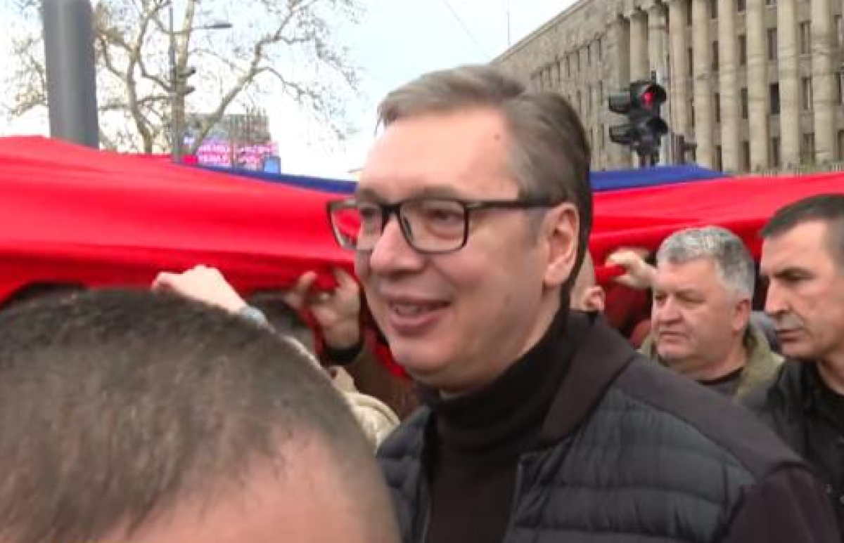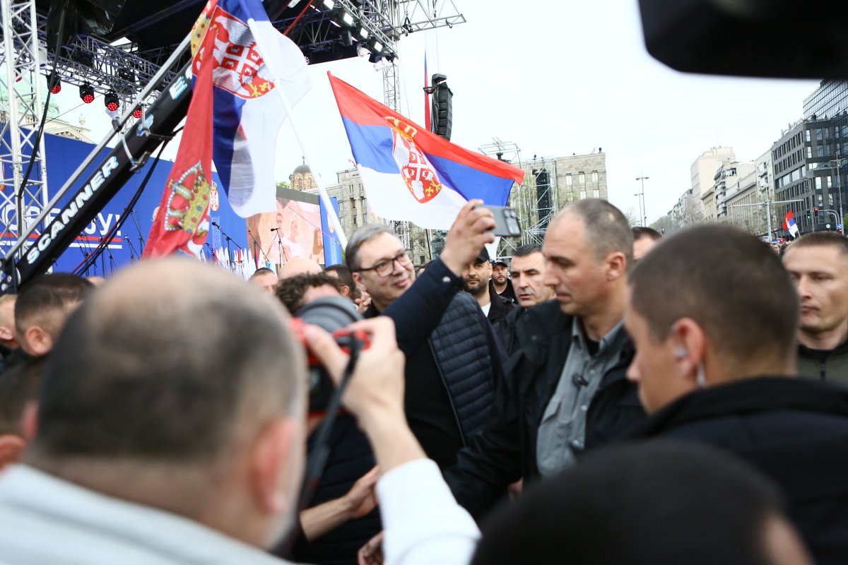 Predsednik Aleksandar Vučić je oko 17.30 sati ispred Predsedništva kod Pionirskog parka dočekao najdužu zastavu koja je preneta od vlade do parlamenta, gde je počeo svenarodni skup i istakao da je su građani poslali najlepšu moguću poruku - da ne daju Srbiju.
