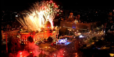 Na glavnoj bini ispred Doma narodne skupštine nastupa Baja Mali Knindža, a njemu se na bini u jednom trenutku pridružio predsednik Republike Srpske Milorad Dodik.