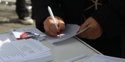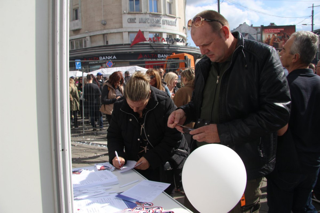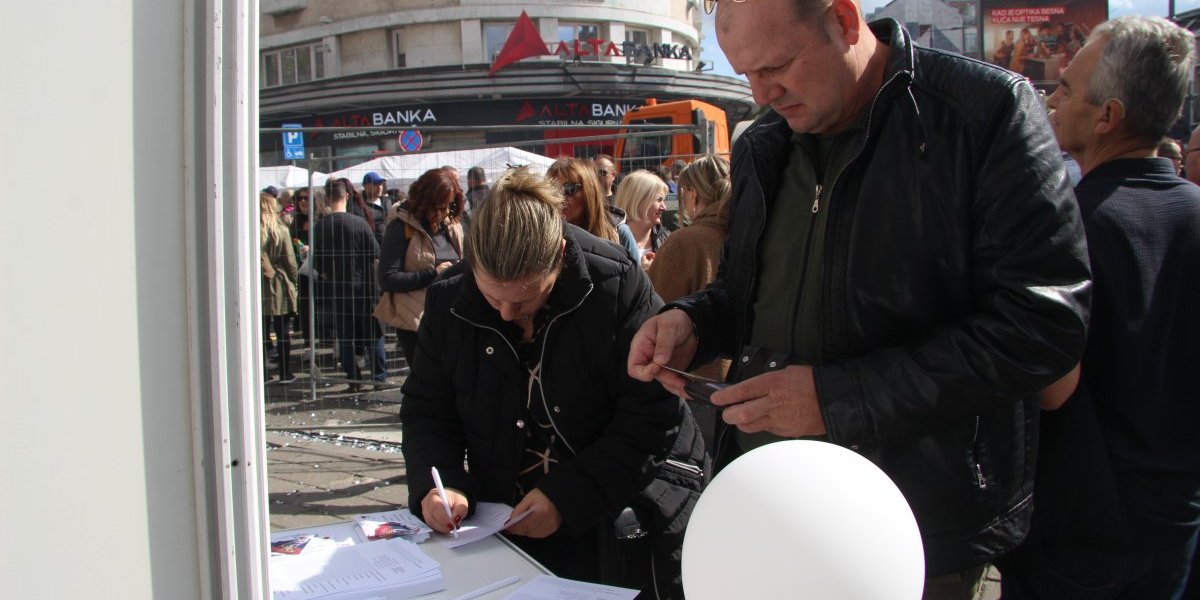 Veliki broj građana na štandu na platou ispred Doma Narodne skupštine, u okviru skupa "Ne damo Srbiju", potpisuje pristupnice svenarodnom pokretu.