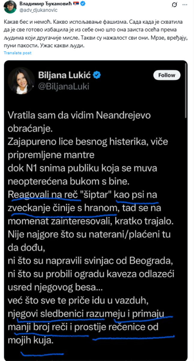 - Kakav bes i nemoć. Kakvo ispoljavanje fašizma. Sada kada je shvatila da je sve gotovo izbacila je iz sebe ono što ona zaista oseća prema ljudima koji drugačije misle. Takvi su nažalost svi oni. Mrze, vređaju, puni pakosti. Užas kakvi ljudi - poručio je Đukanović.