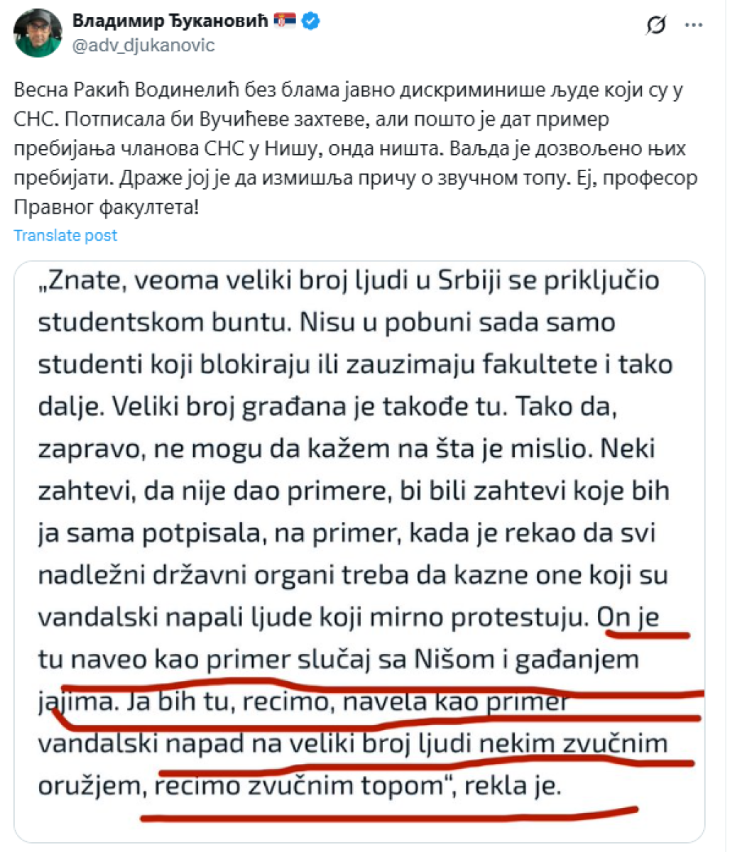 - Vesna Rakić Vodinelić bez blama javno diskriminiše ljude koji su u SNS. Potpisala bi Vučićeve zahteve, ali pošto je dat primer prebijanja članova SNS u Nišu, onda ništa. Valjda je dozvoljeno njih prebijati. Draže joj je da izmišlja priču o zvučnom topu. Ej, profesor Pravnog fakulteta - poručio je Đukanović.