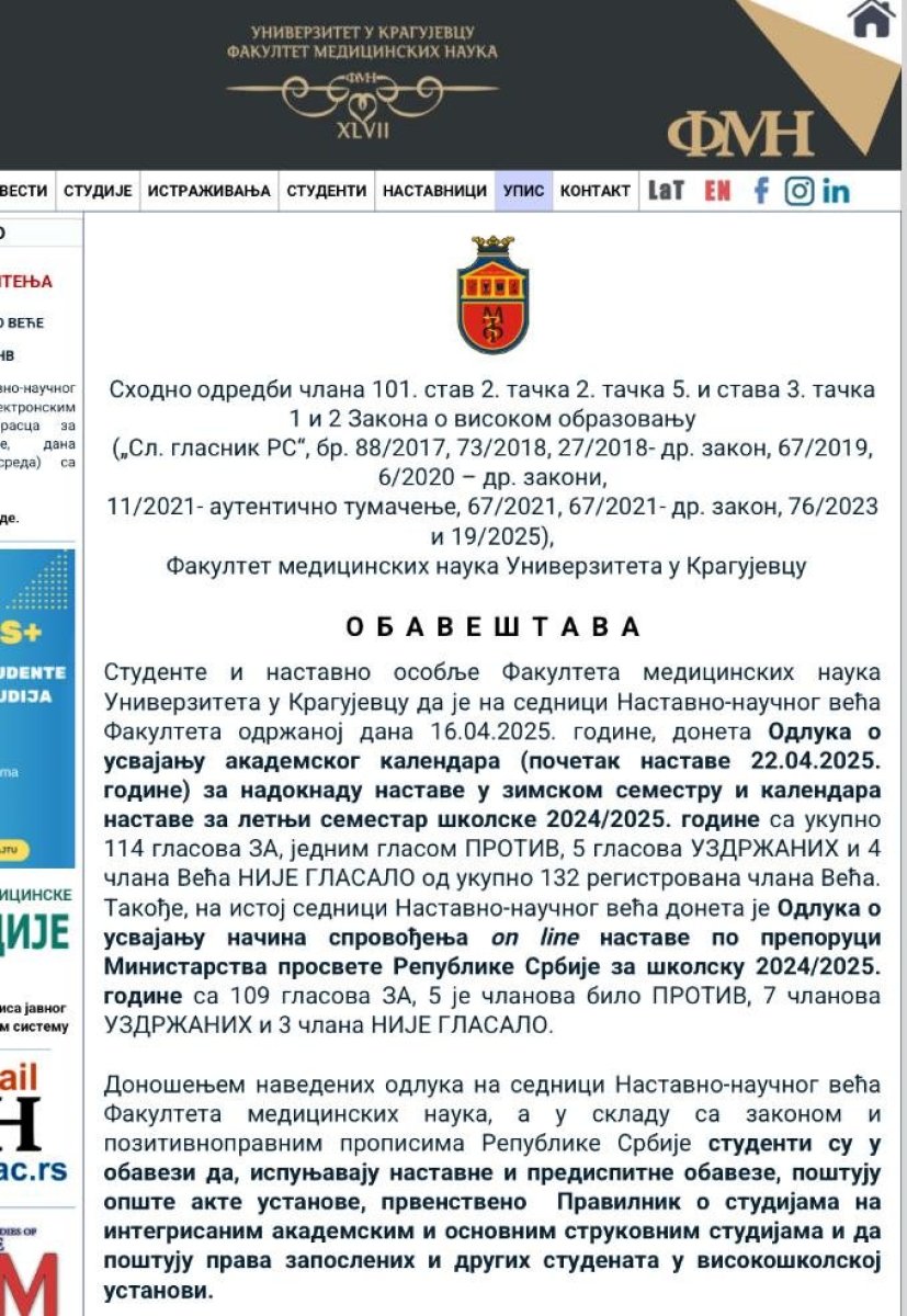 Na sednici Nastavno-naučnog veća doneta je zvanična odluka - nastava za zimski i letnji semestar zvanično počinje 22. aprila 2025. godine!