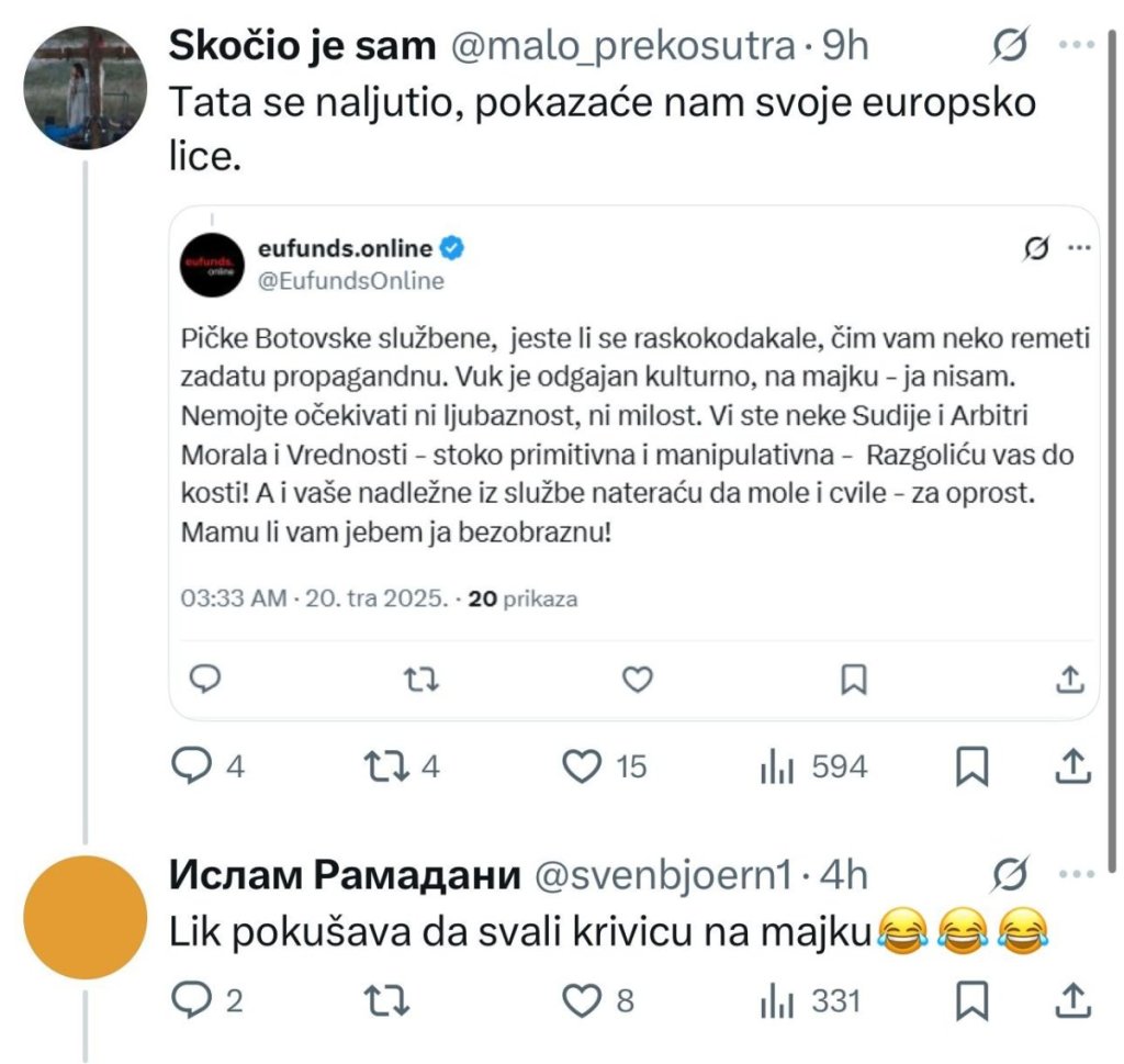 Inače, nakon što su korisnici društvenih mreža odlučno negodovali zbog objava koje lajkuje Nektarijević, oglasio se i njegov otac i uputio stravične pretnje.