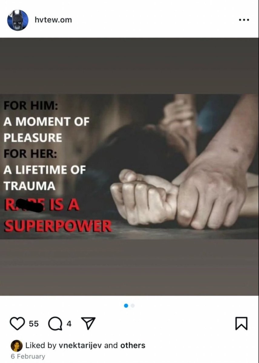 Nektarijević je, kako se može videti isečaka sa Instragrama, ne jednom otvoreno podržao silovanje i maltretiranje žena.
