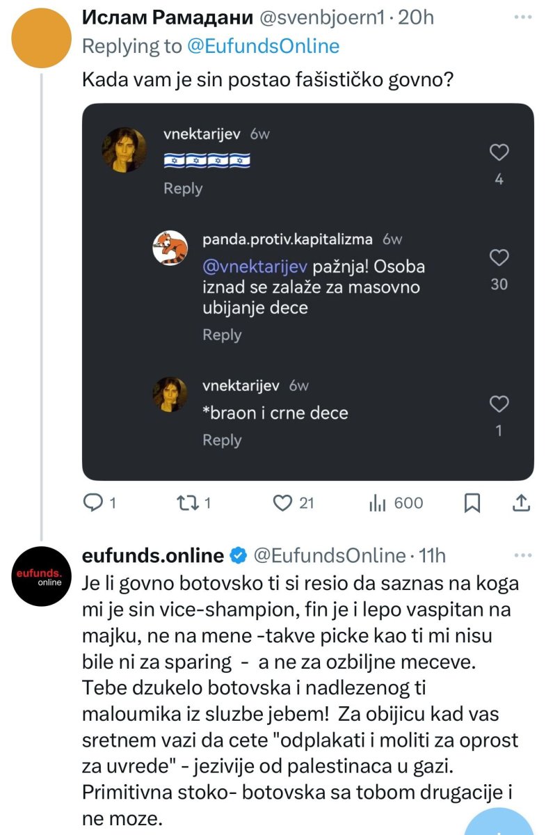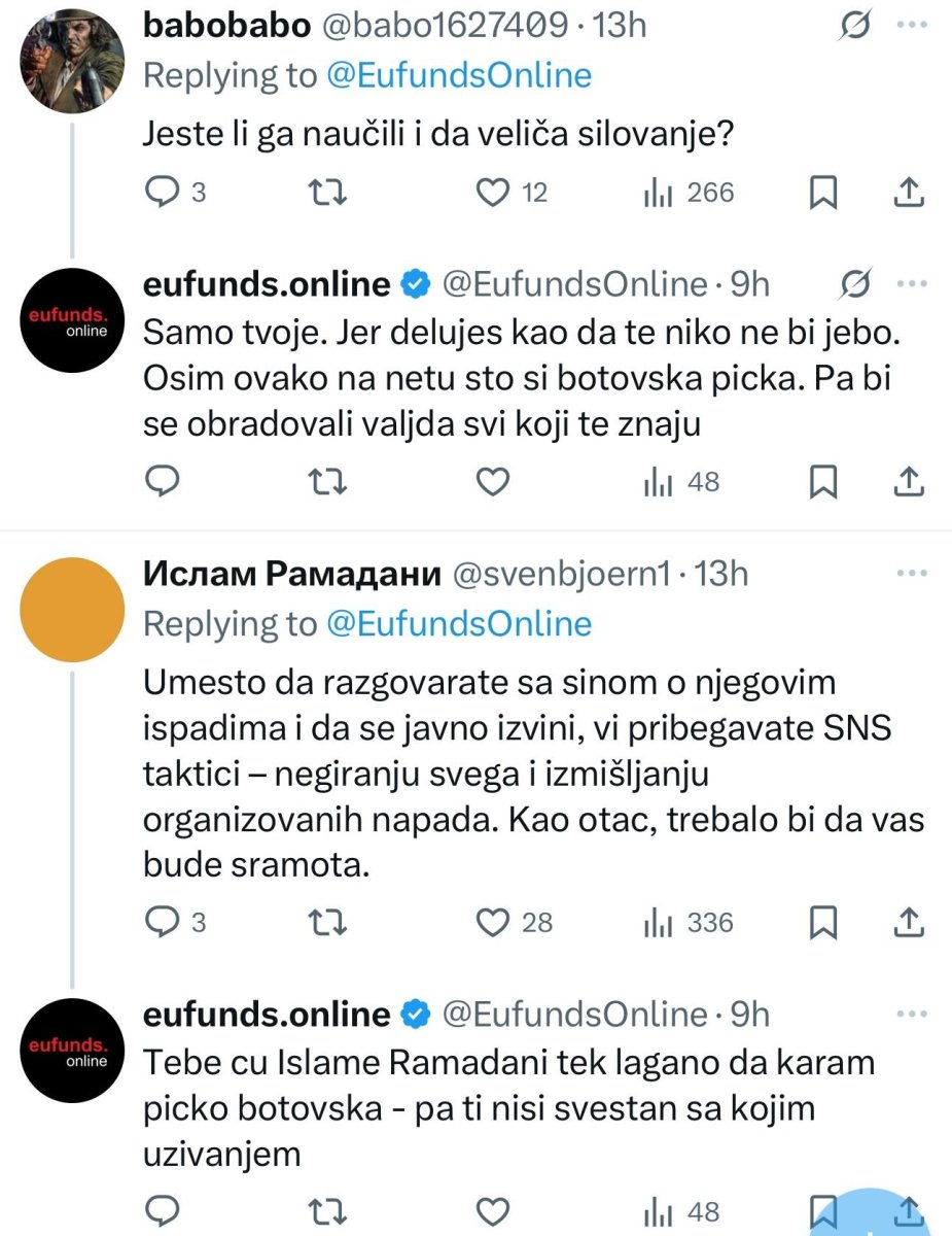 Uz to, njegov otac jednako vulgarno odgovara na kritičke komentare, a da pri tom i otvoreno preti.