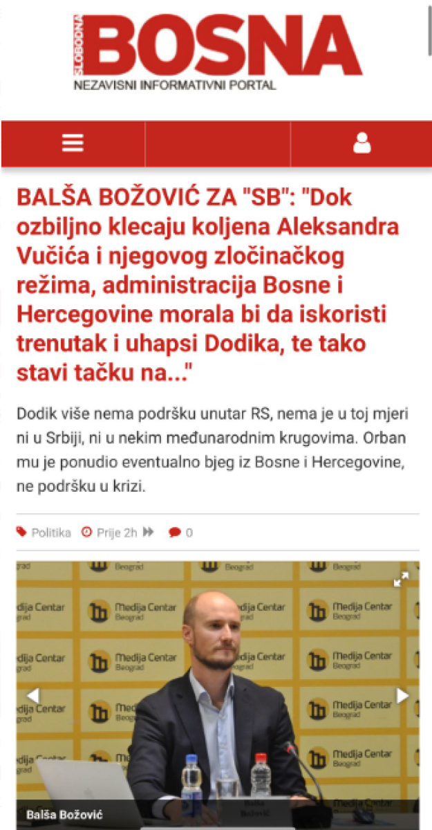 U tekstu pod naslovom "Dok ozbiljno klecaju kolena Aleksandra Vučića i njegovog zločinačkog režima, administracija Bosne i Hercegovine morala bi da iskoristi trenutak da uhapsi Dodika, i tako stavi tačku na..."